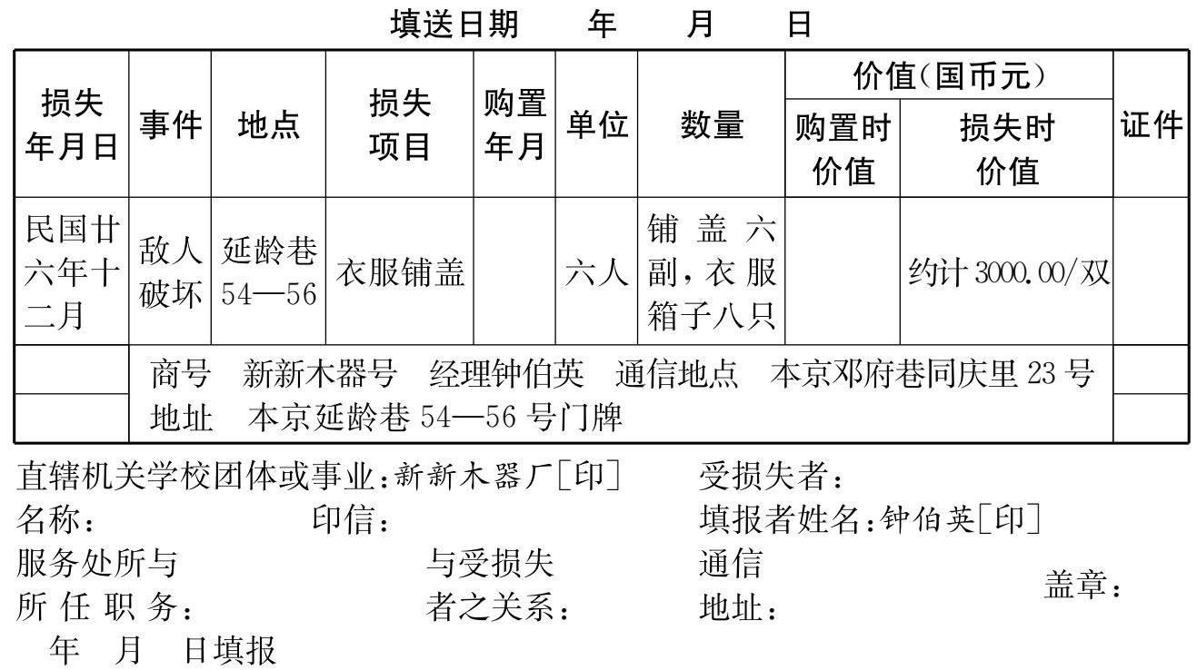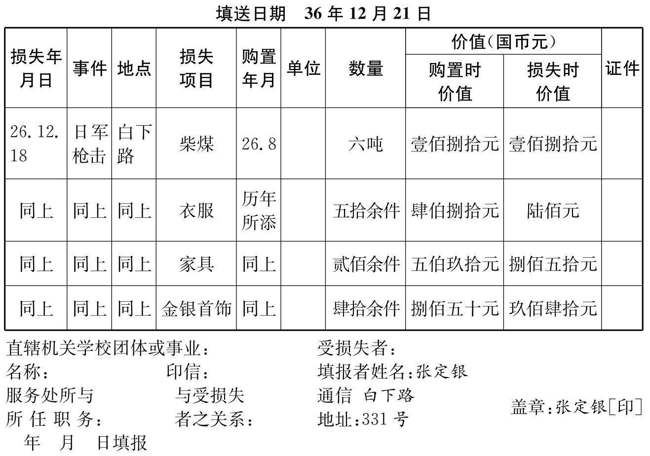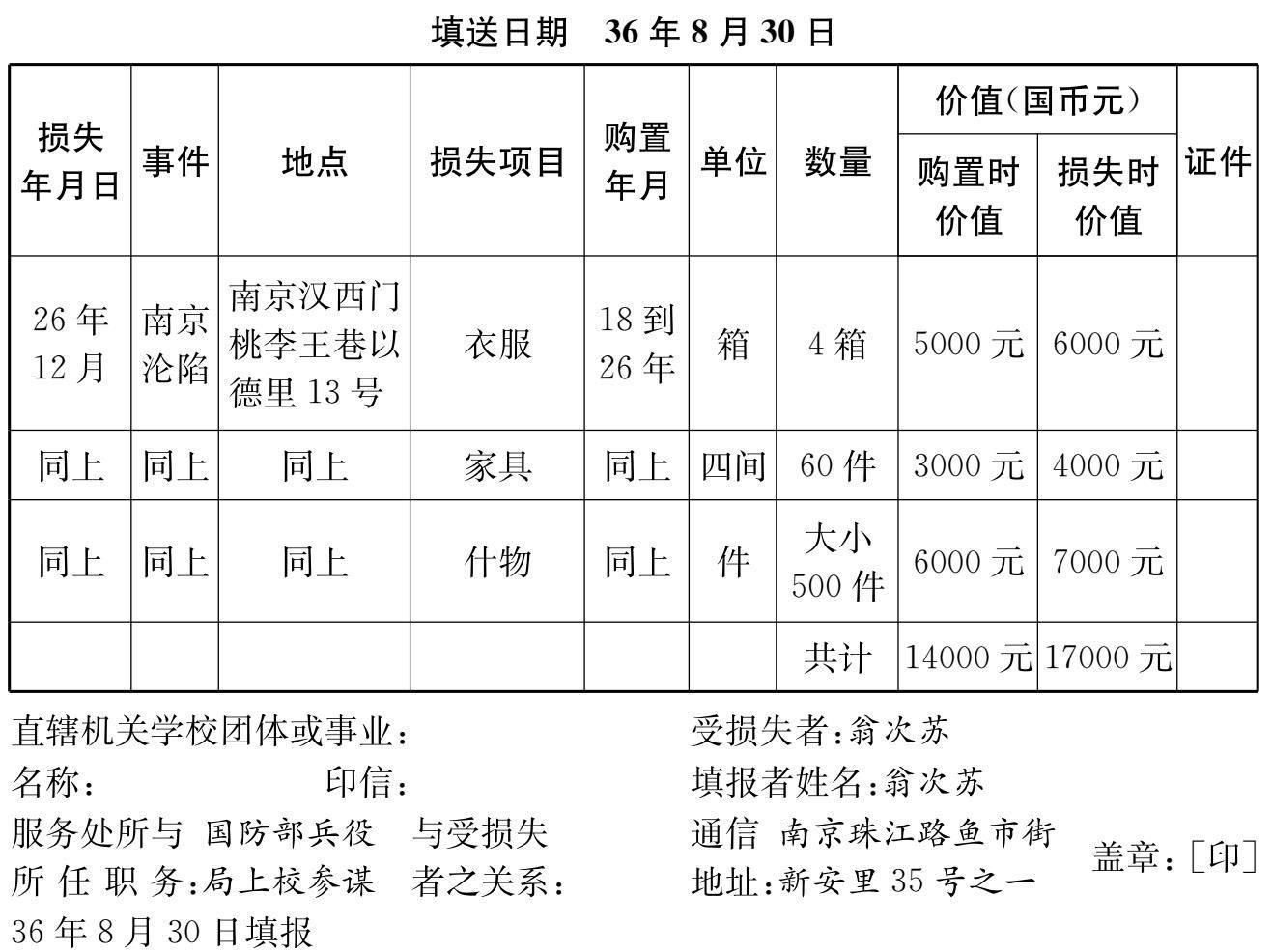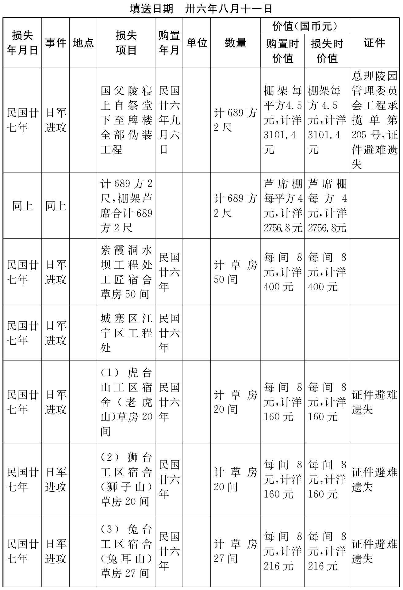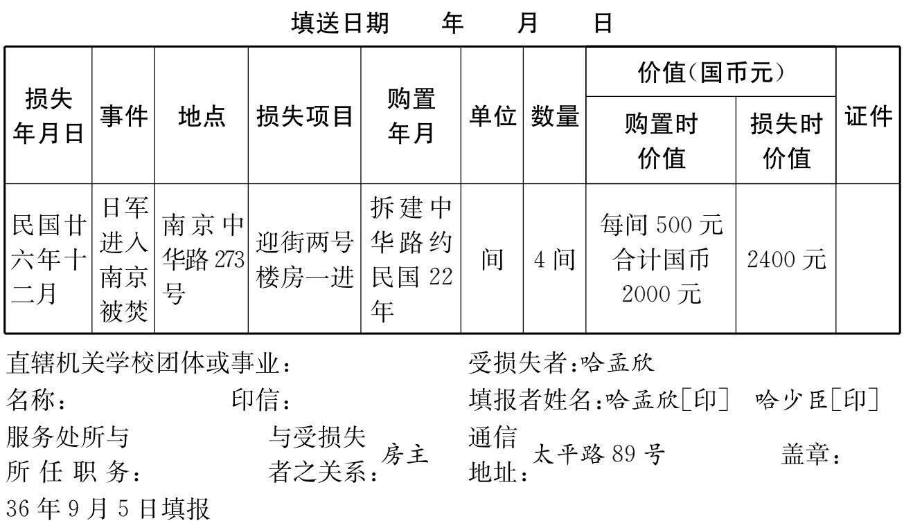 ② 本格及其上面几格填写位置可能有误,疑为“损失时价值”。原档如此。