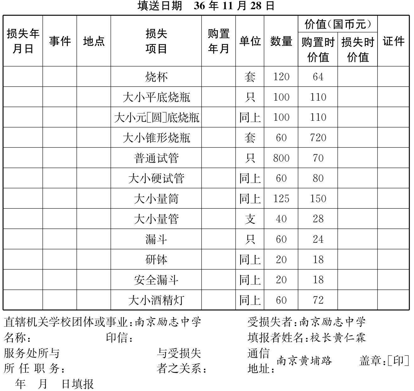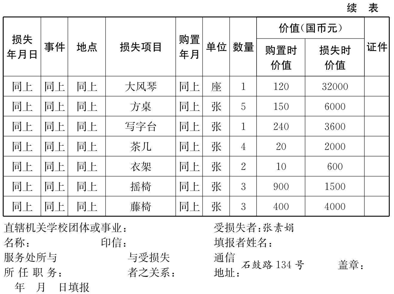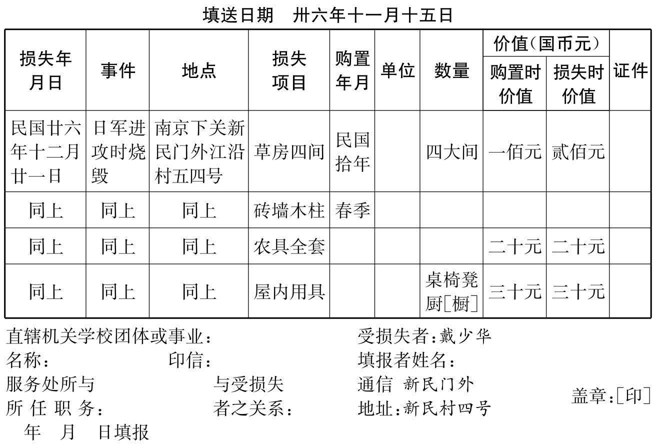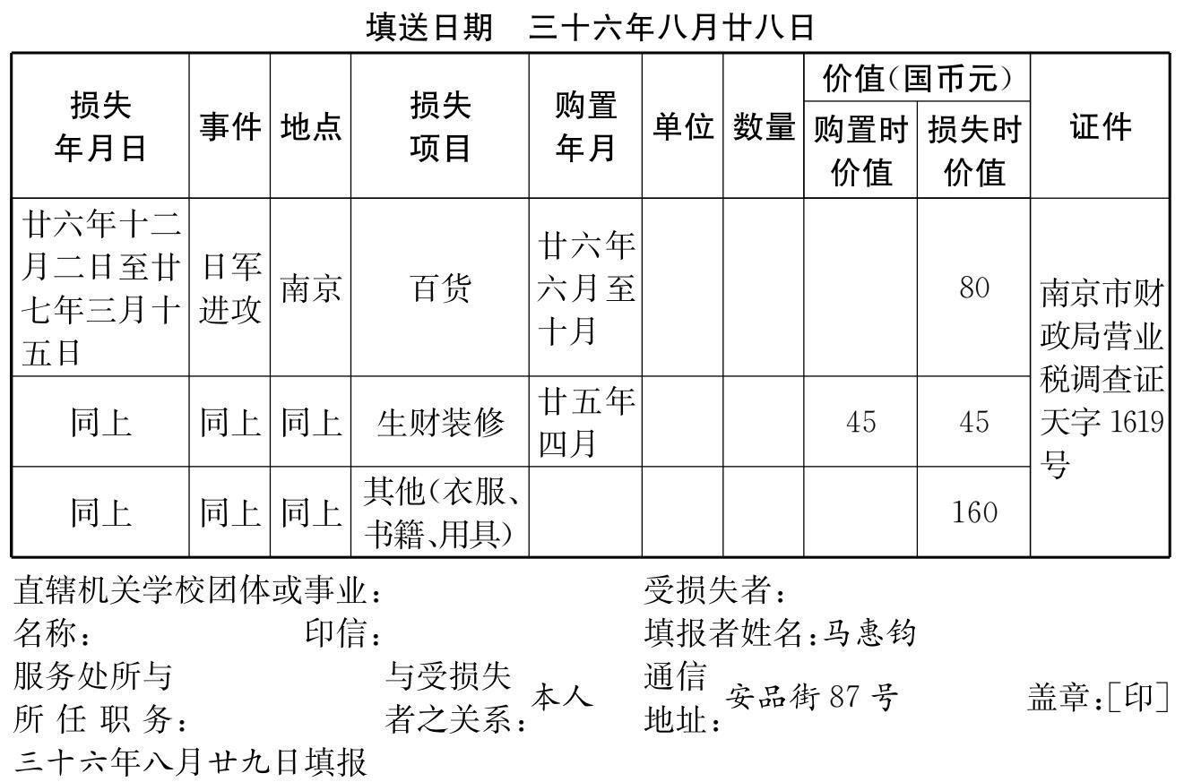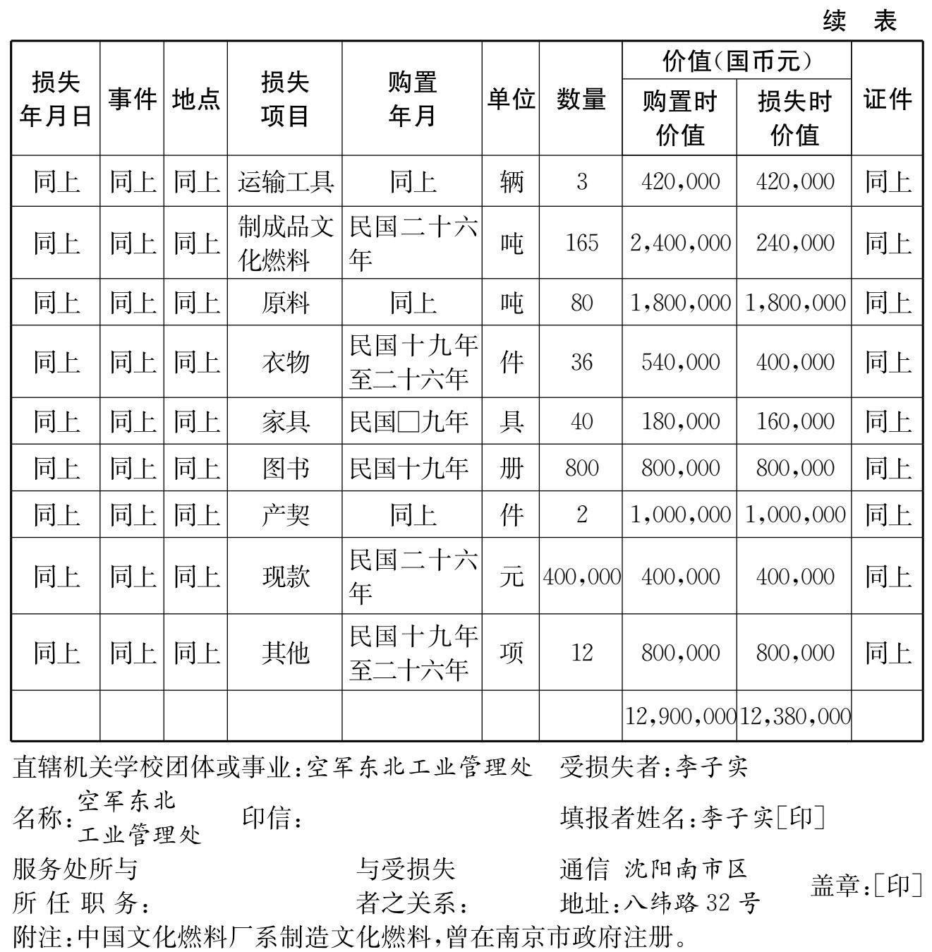 ② 本格及其上面几格填写位置可能有误,疑为“损失时价值”。原档如此。