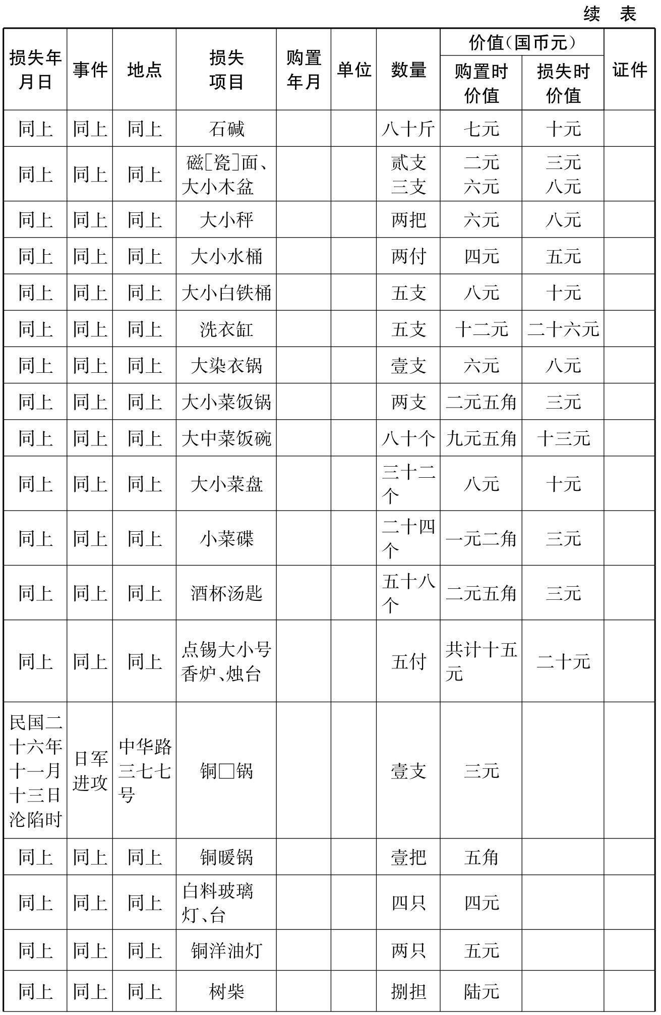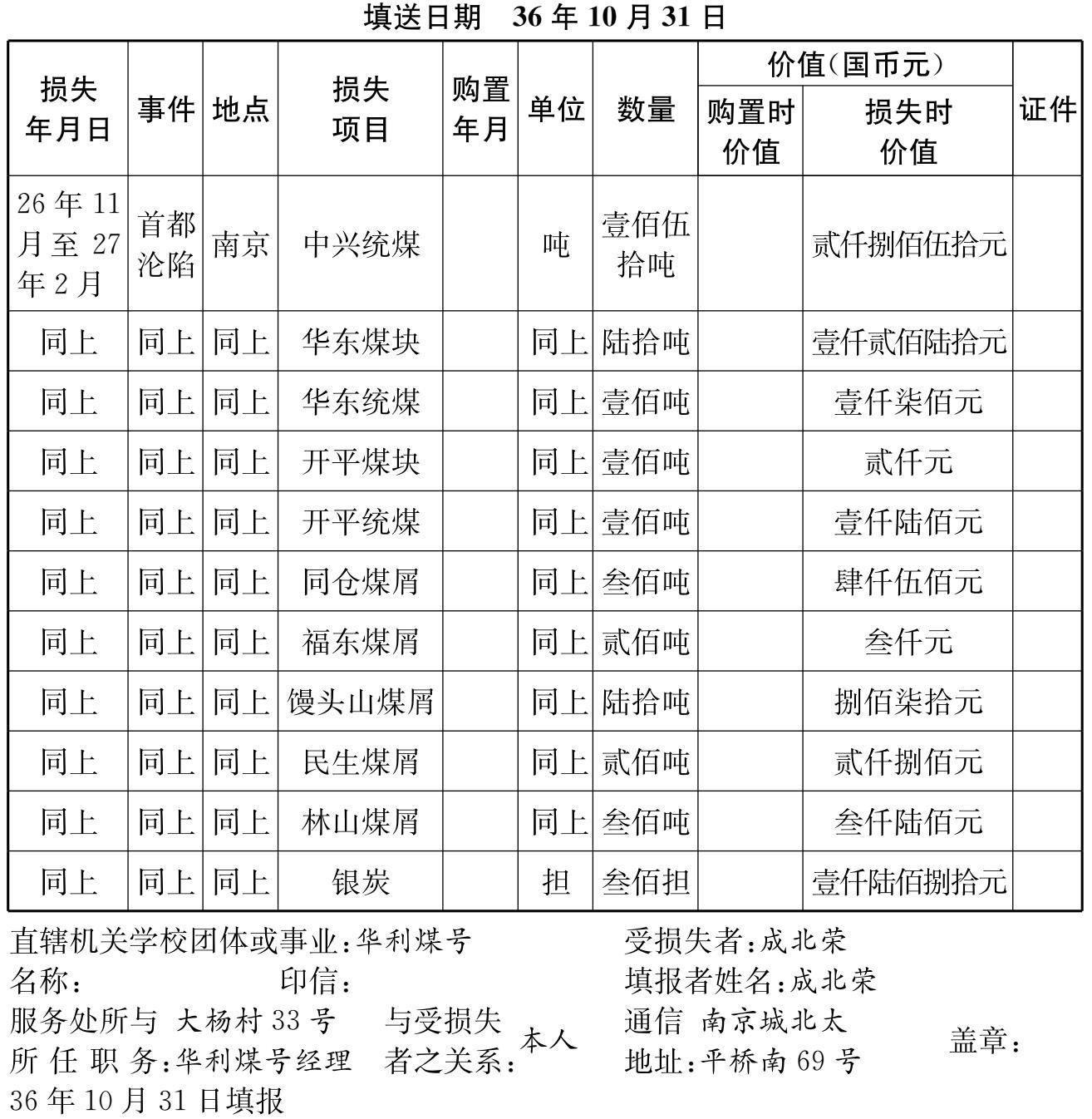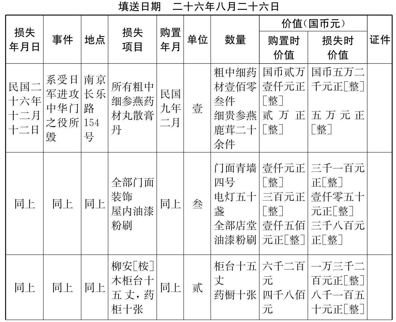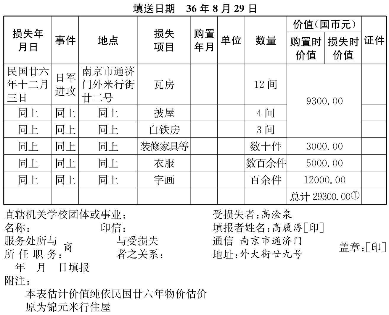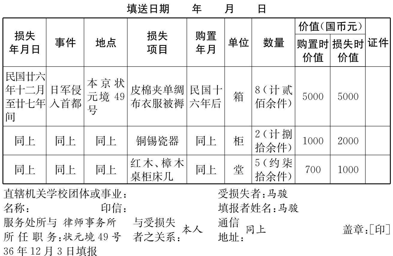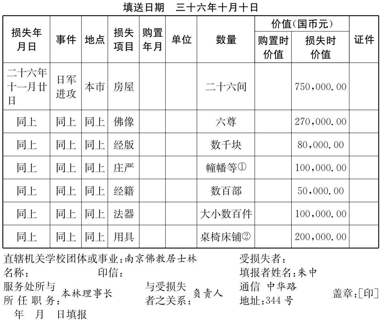 ② 本格及其上面几格填写位置可能有误,疑为“损失时价值”。原档如此。