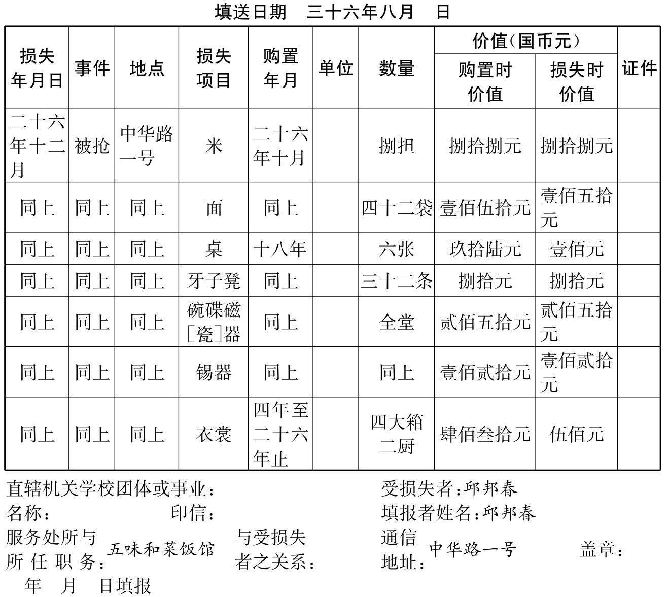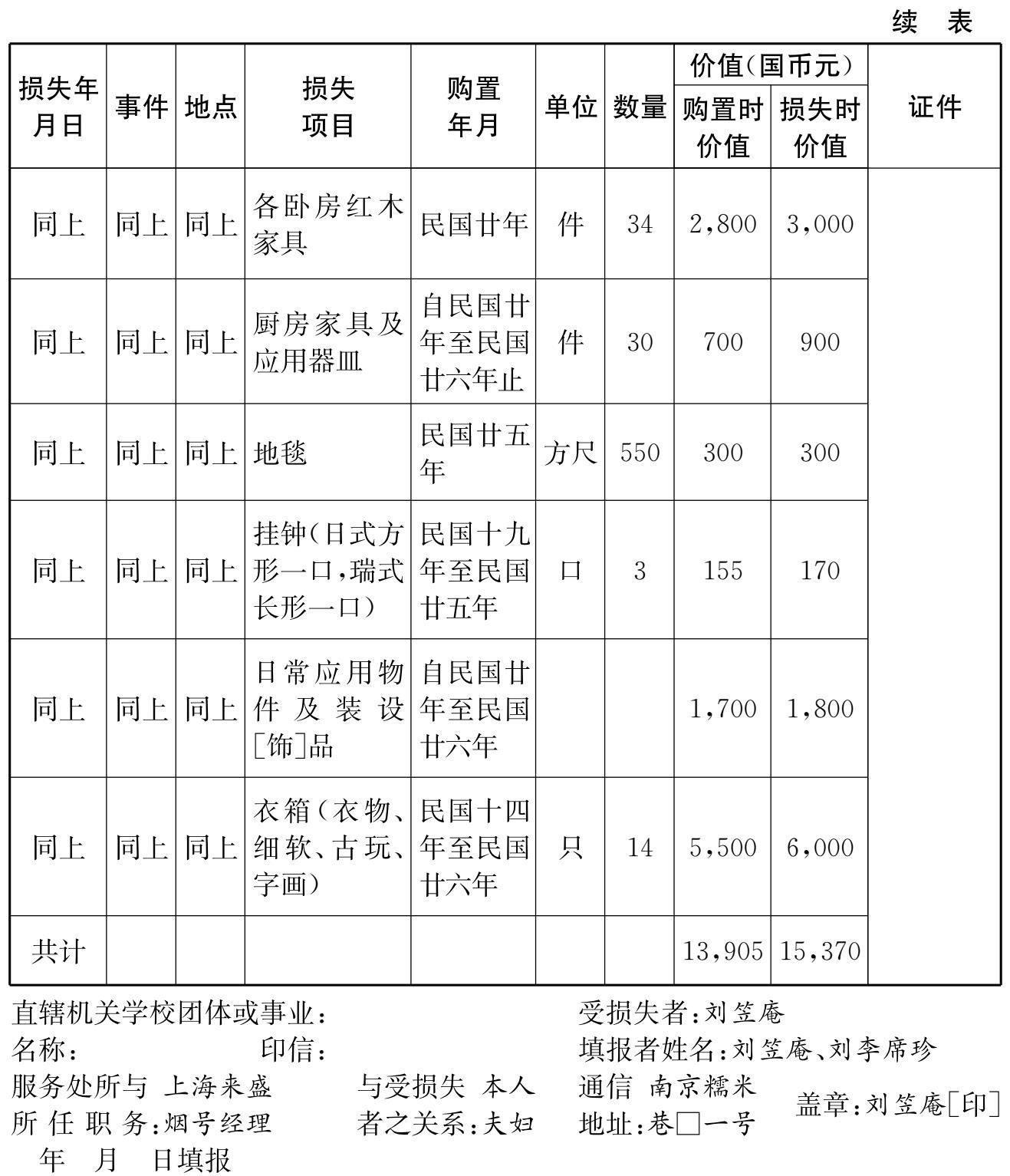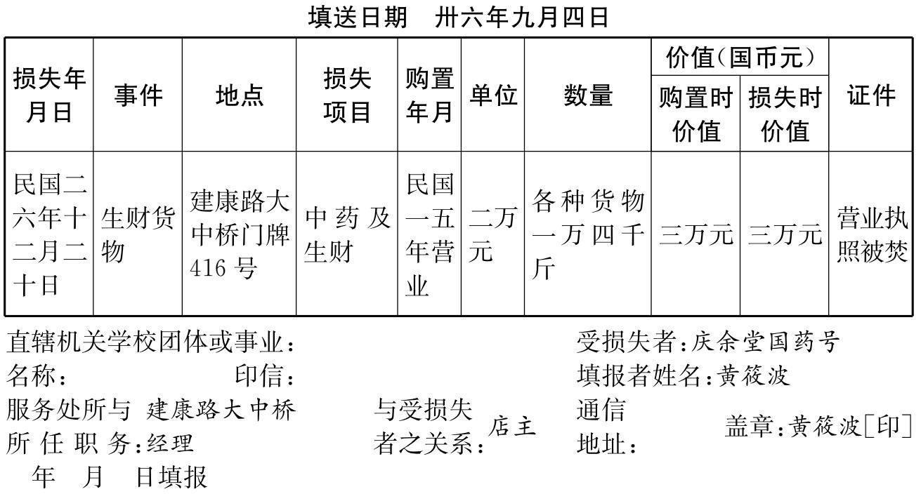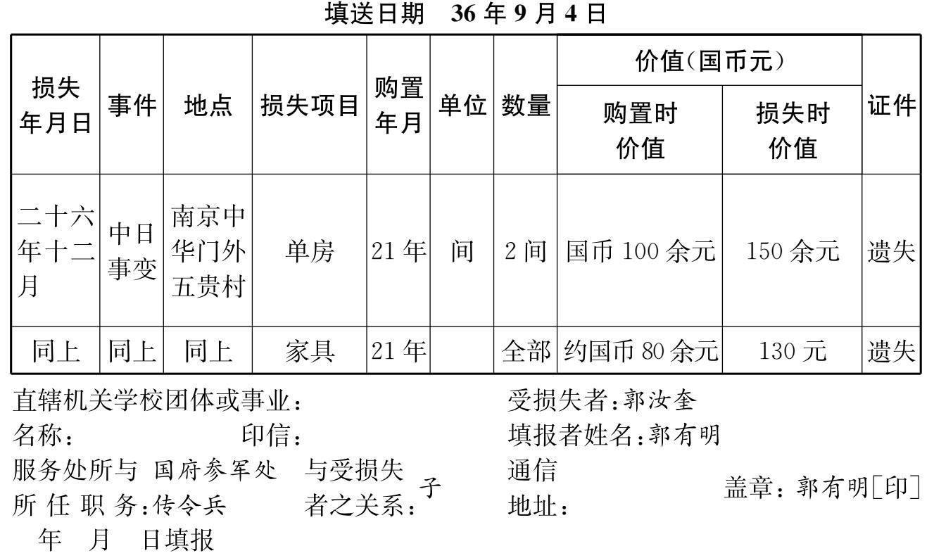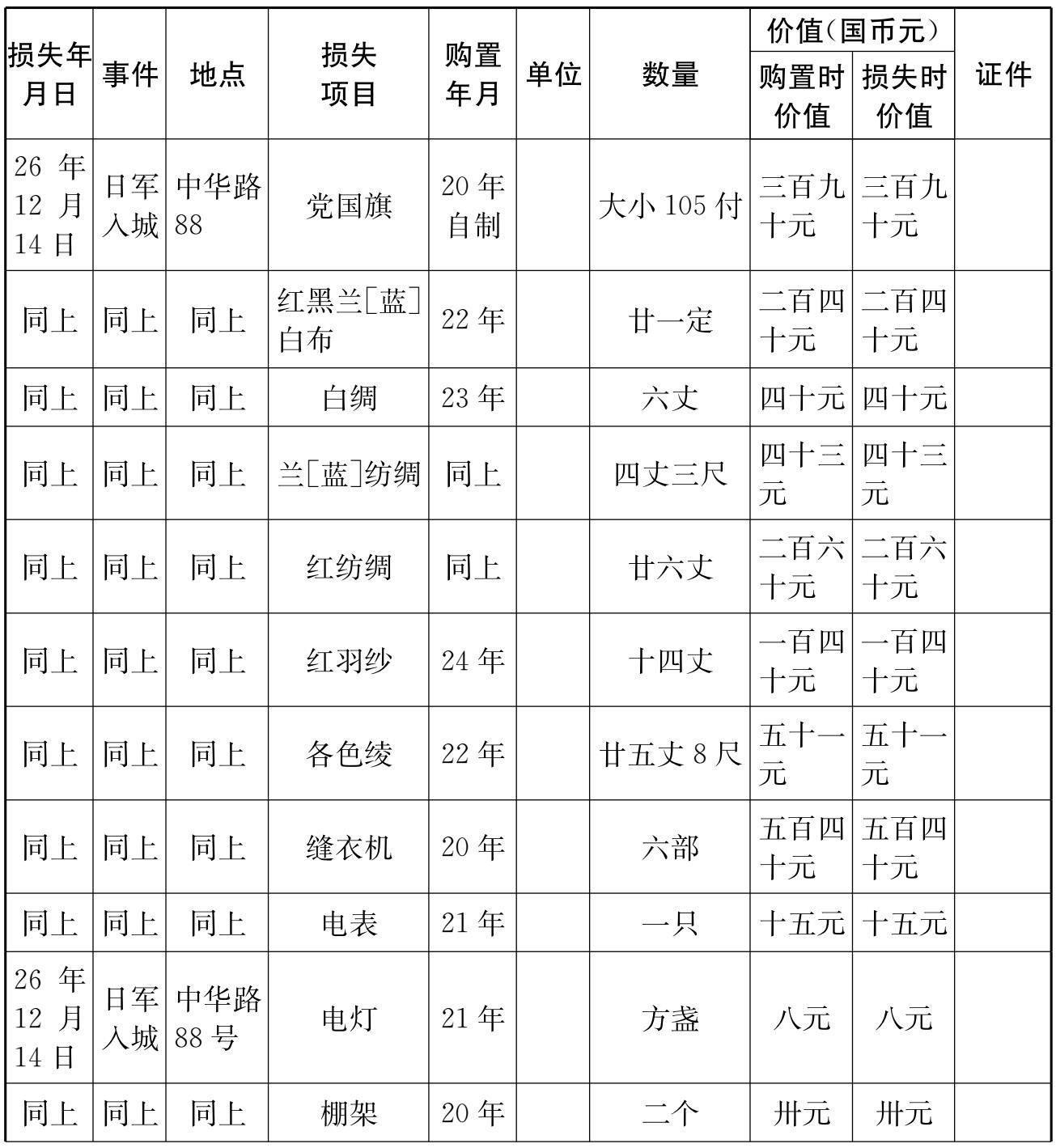 ② 本格及其上面几格填写位置可能有误,疑为“损失时价值”。原档如此。