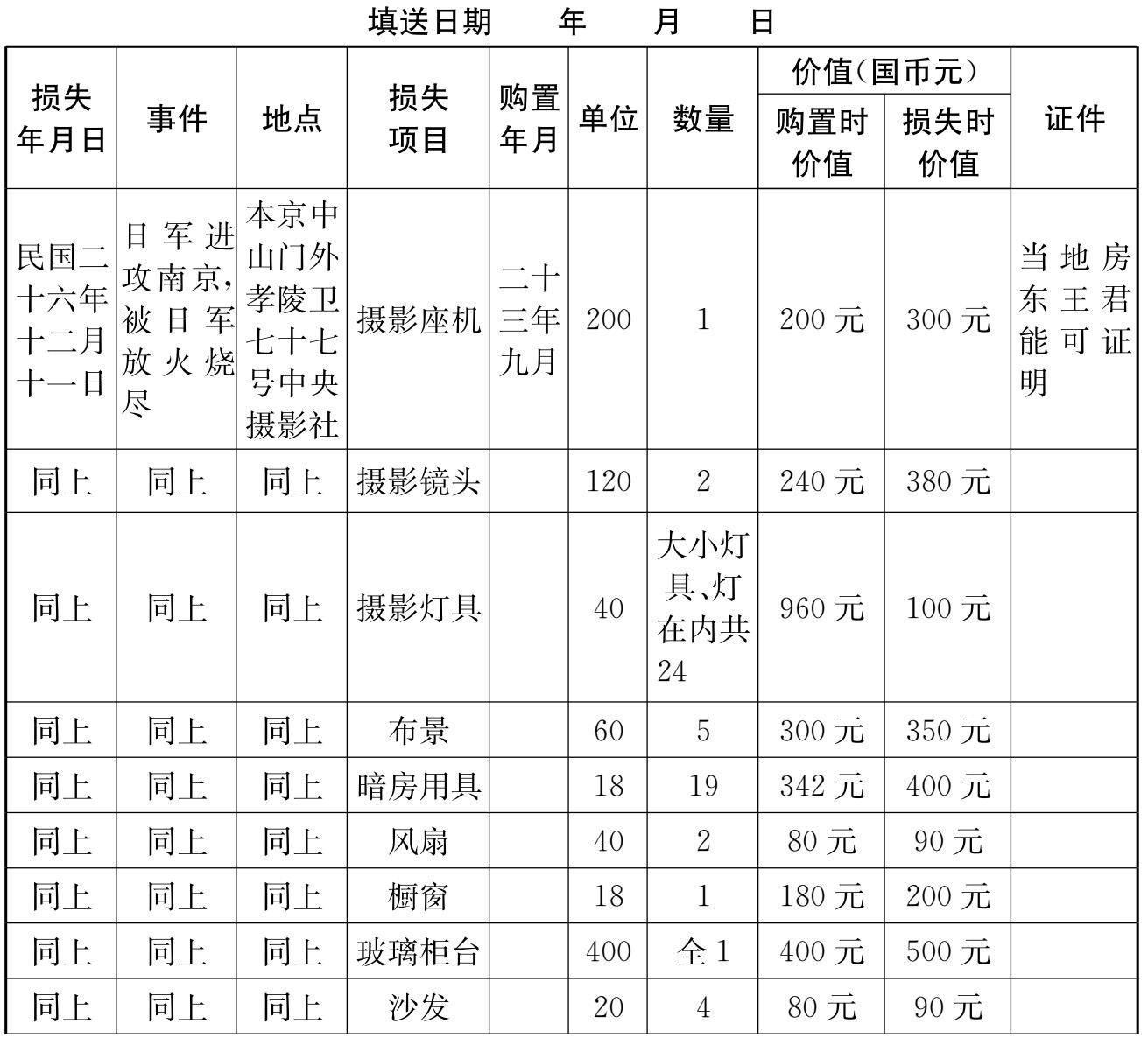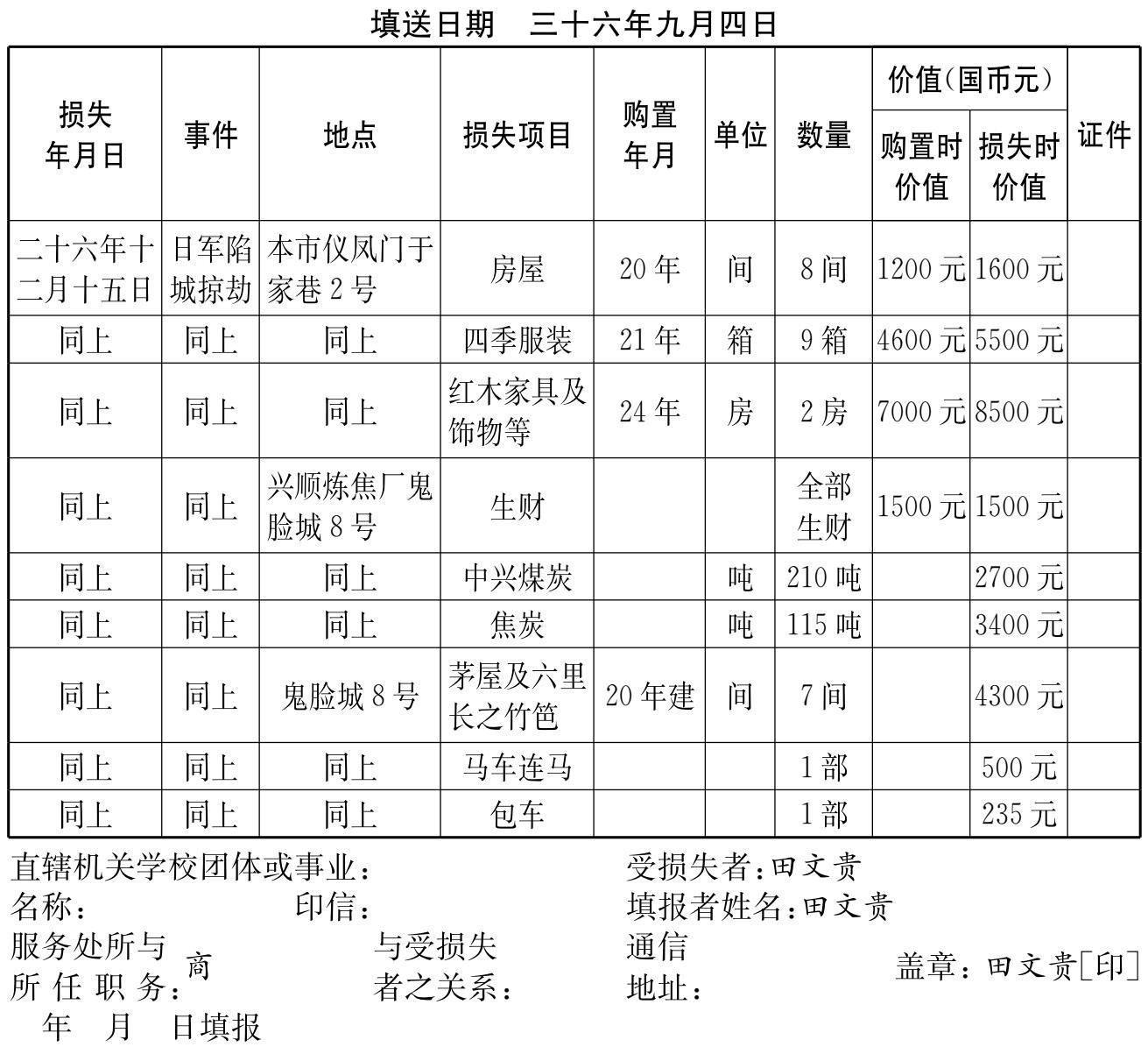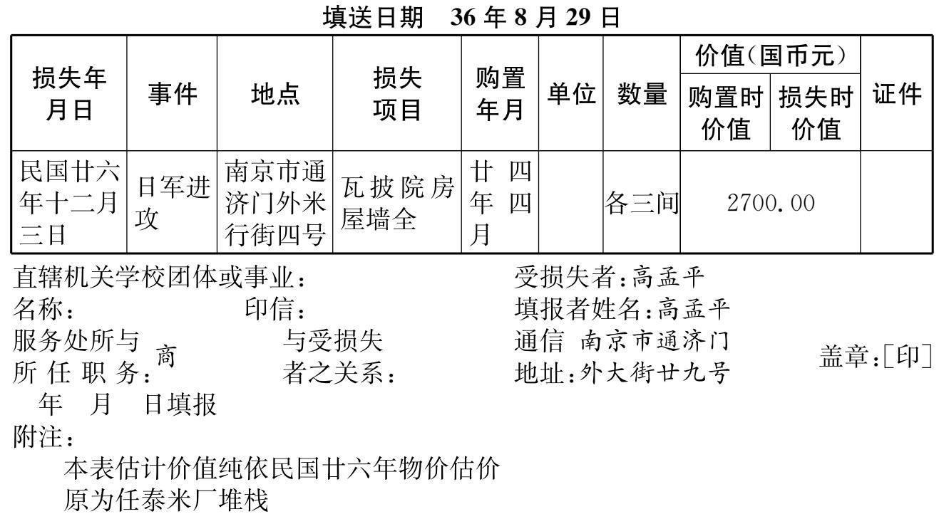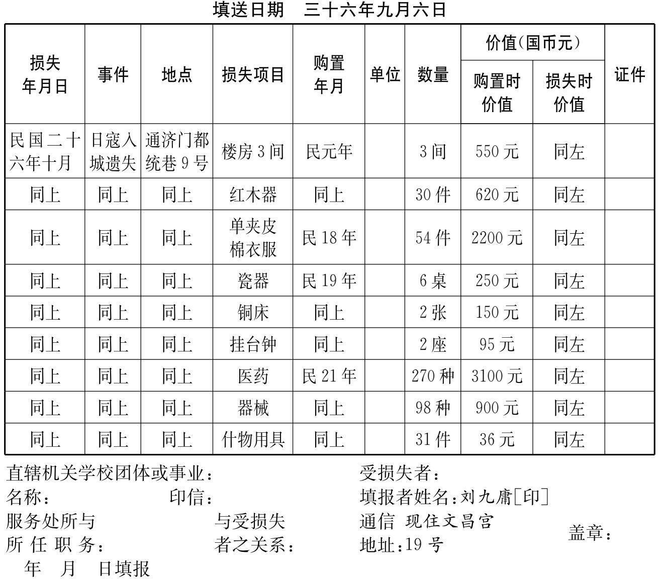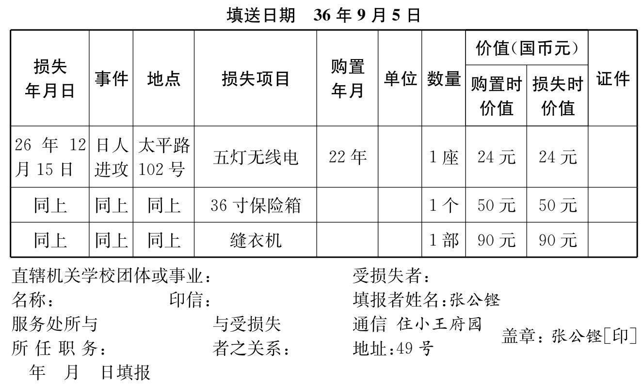 ② 本格及其上面几格填写位置可能有误,疑为“损失时价值”。原档如此。