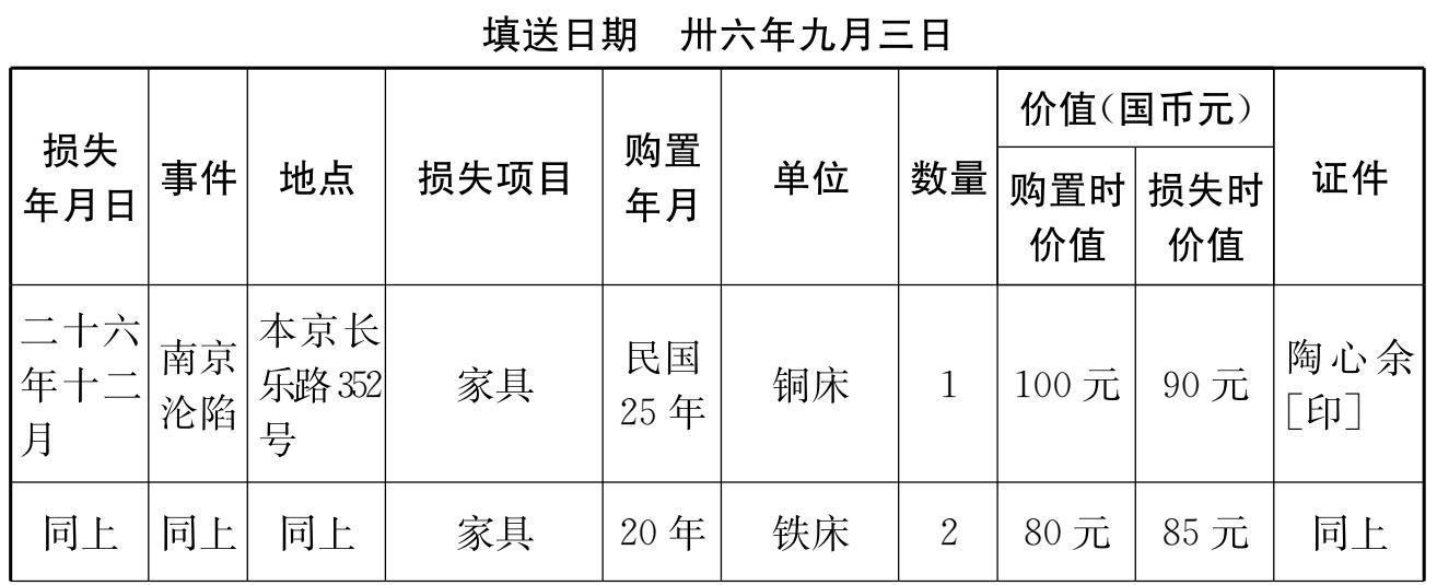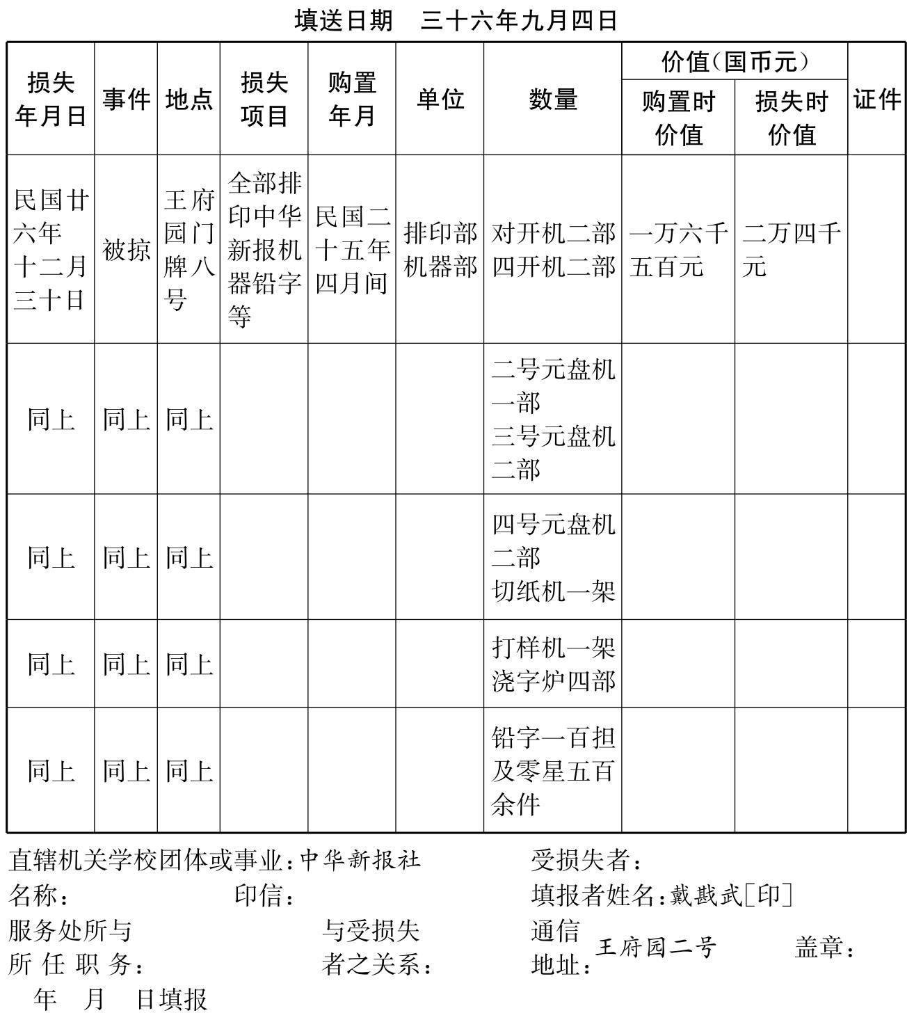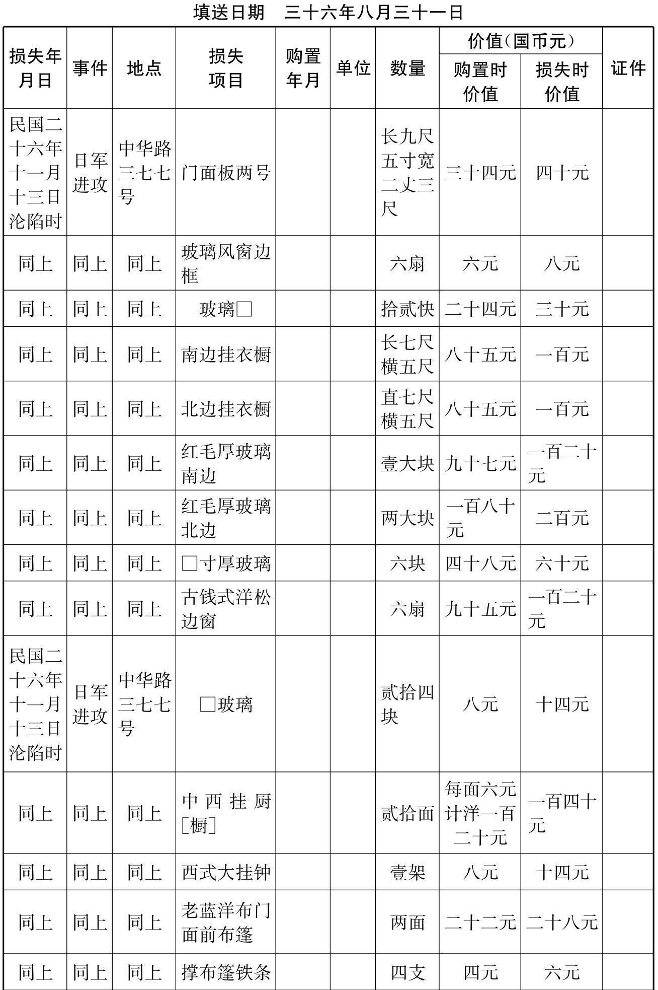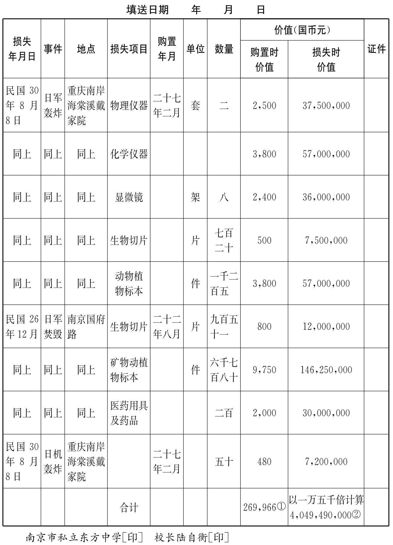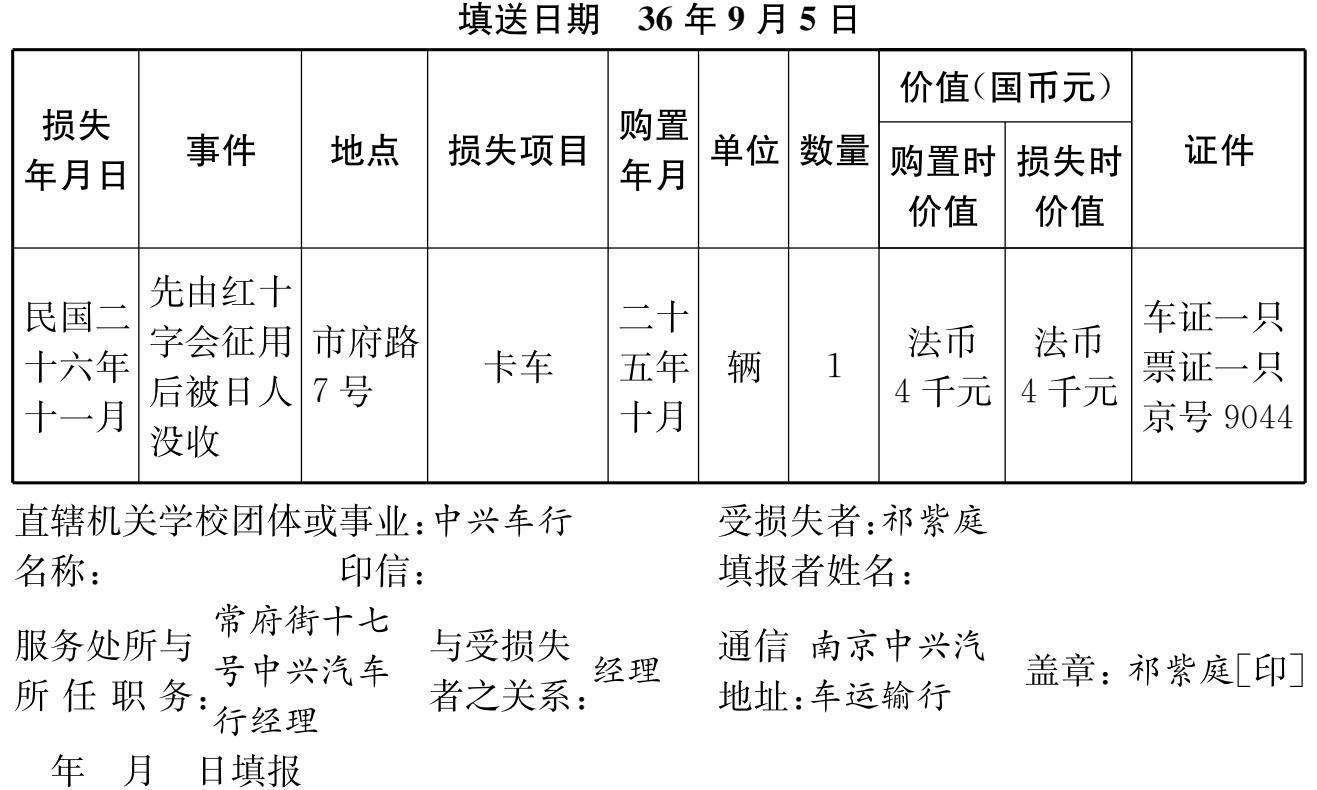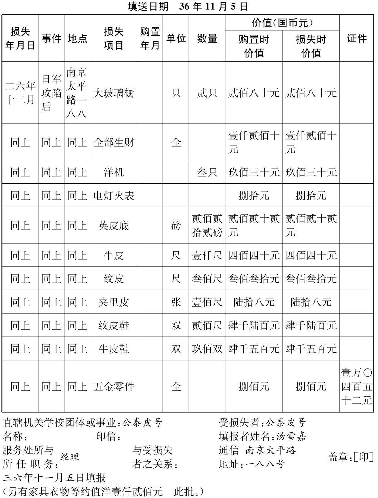 ② 本格及其上面几格填写位置可能有误,疑为“损失时价值”。原档如此。