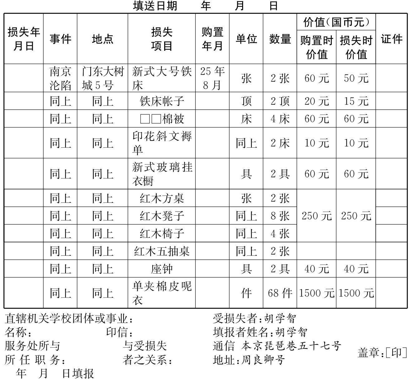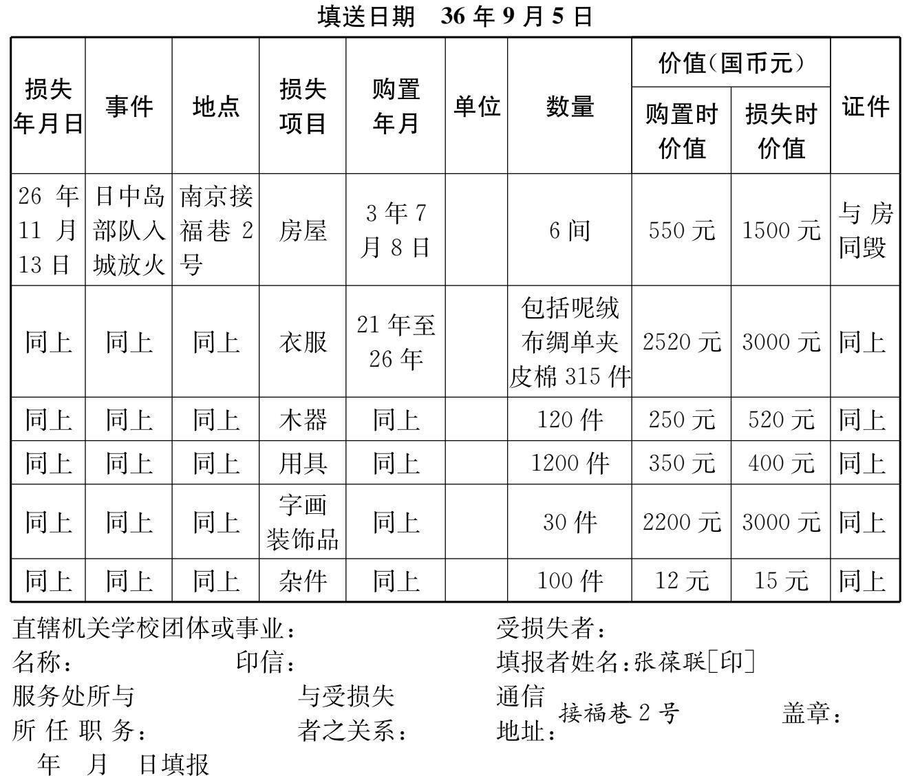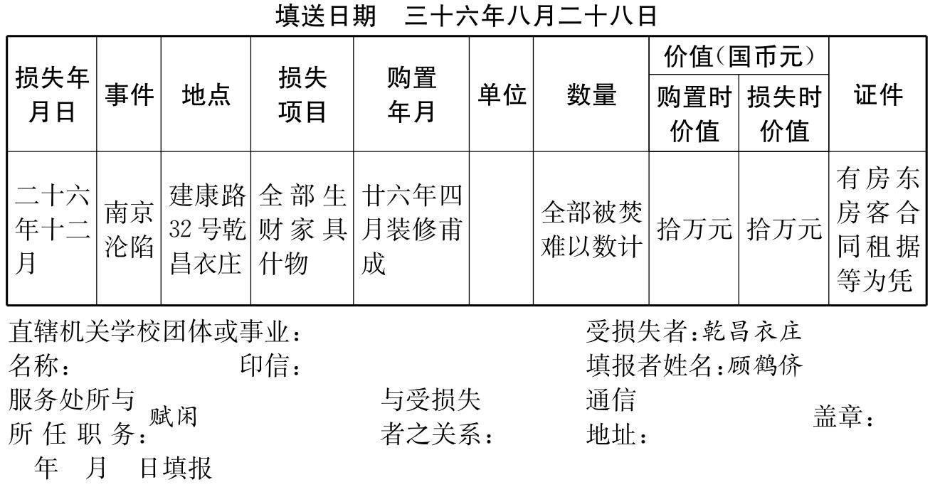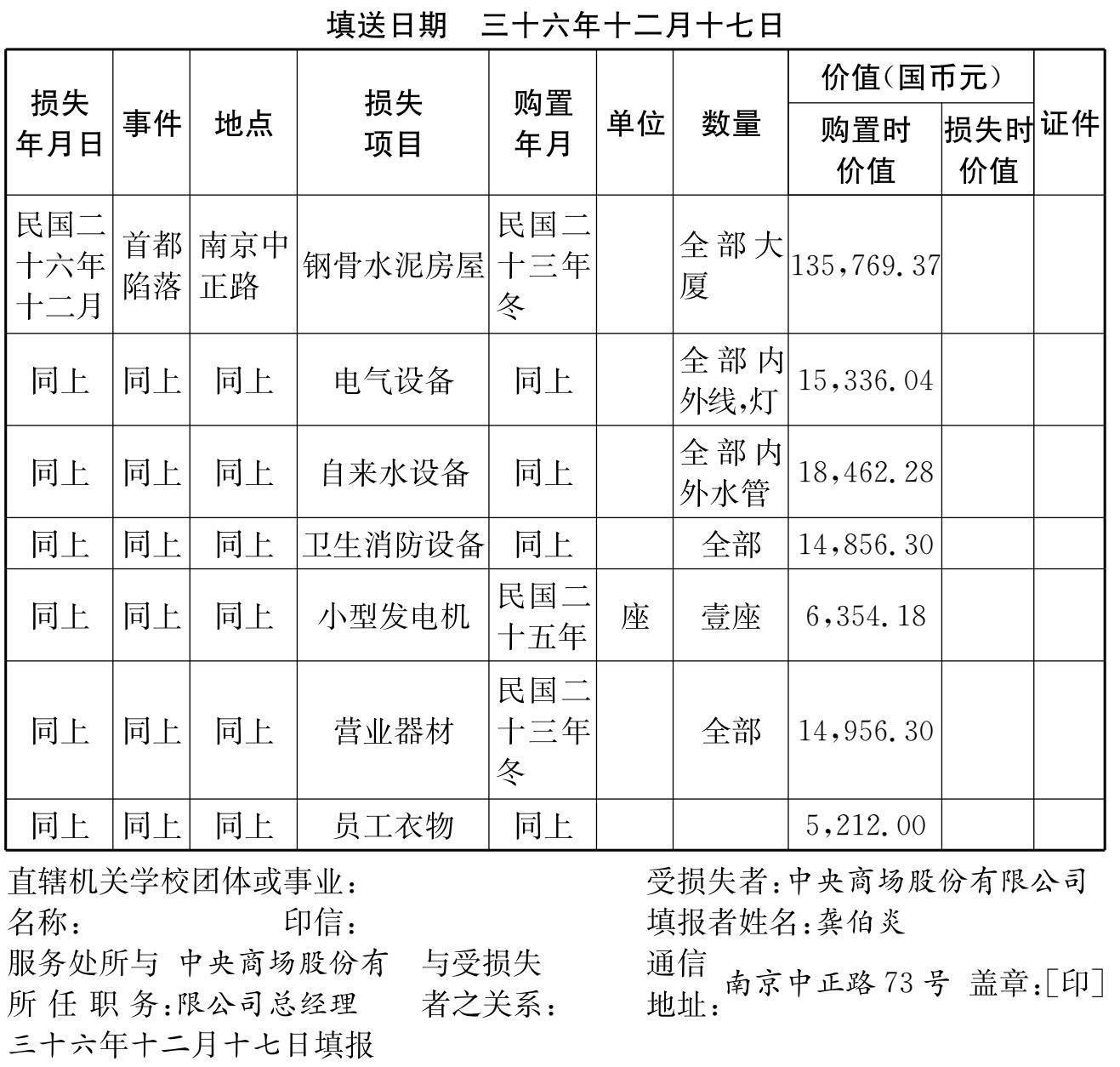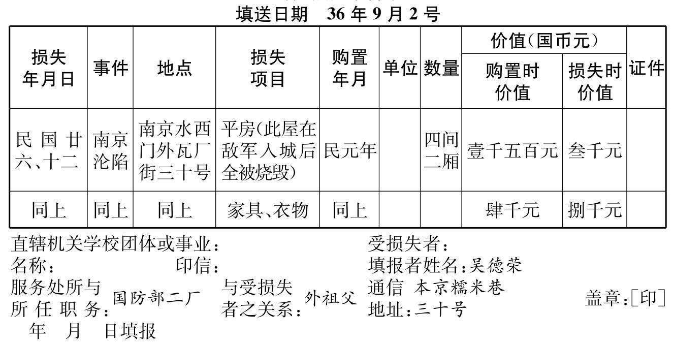 ② 本格及其上面几格填写位置可能有误,疑为“损失时价值”。原档如此。