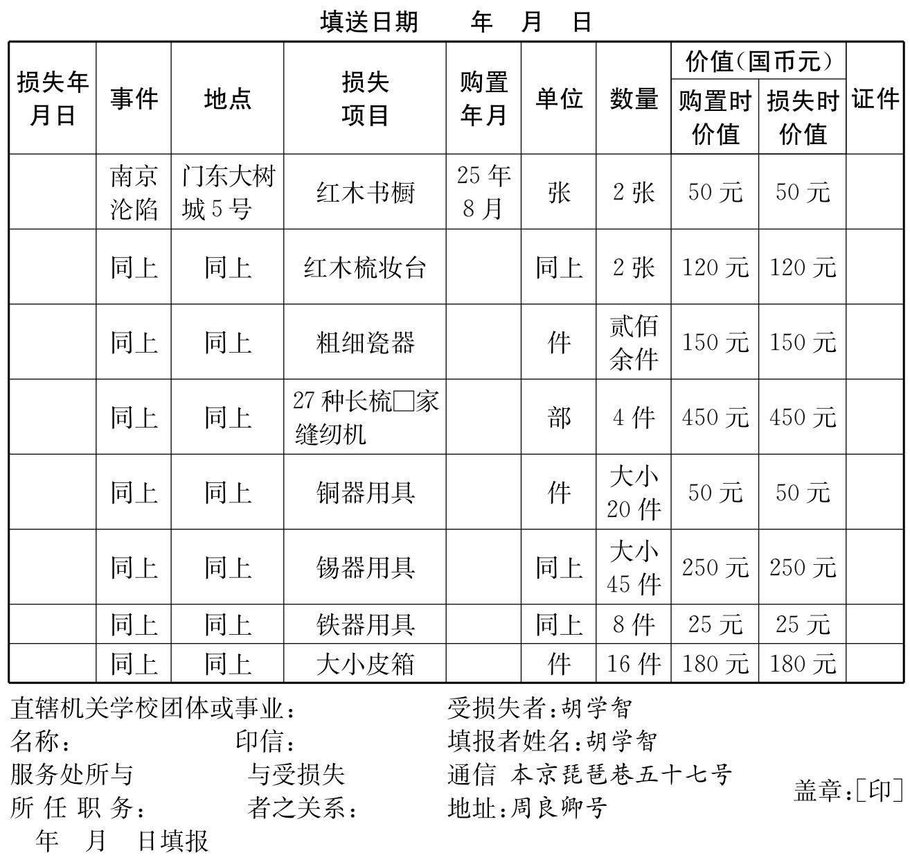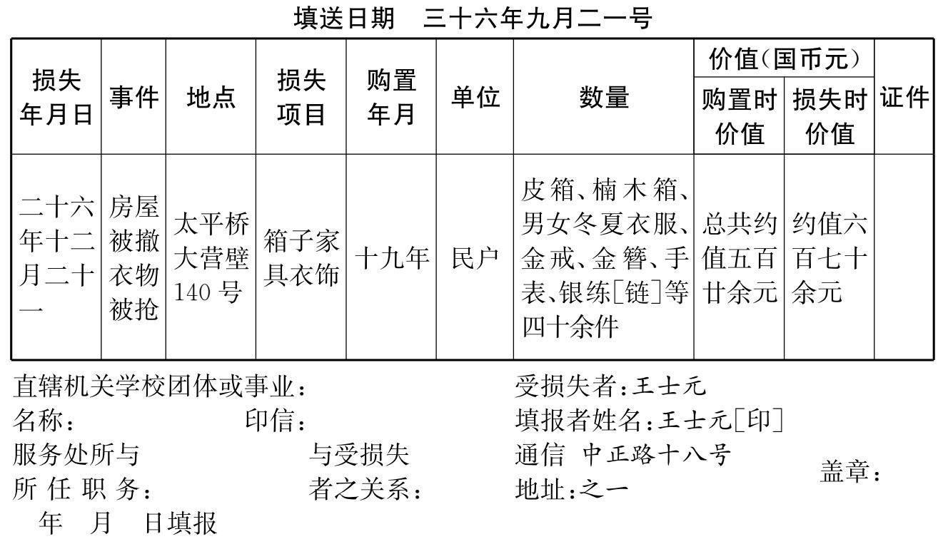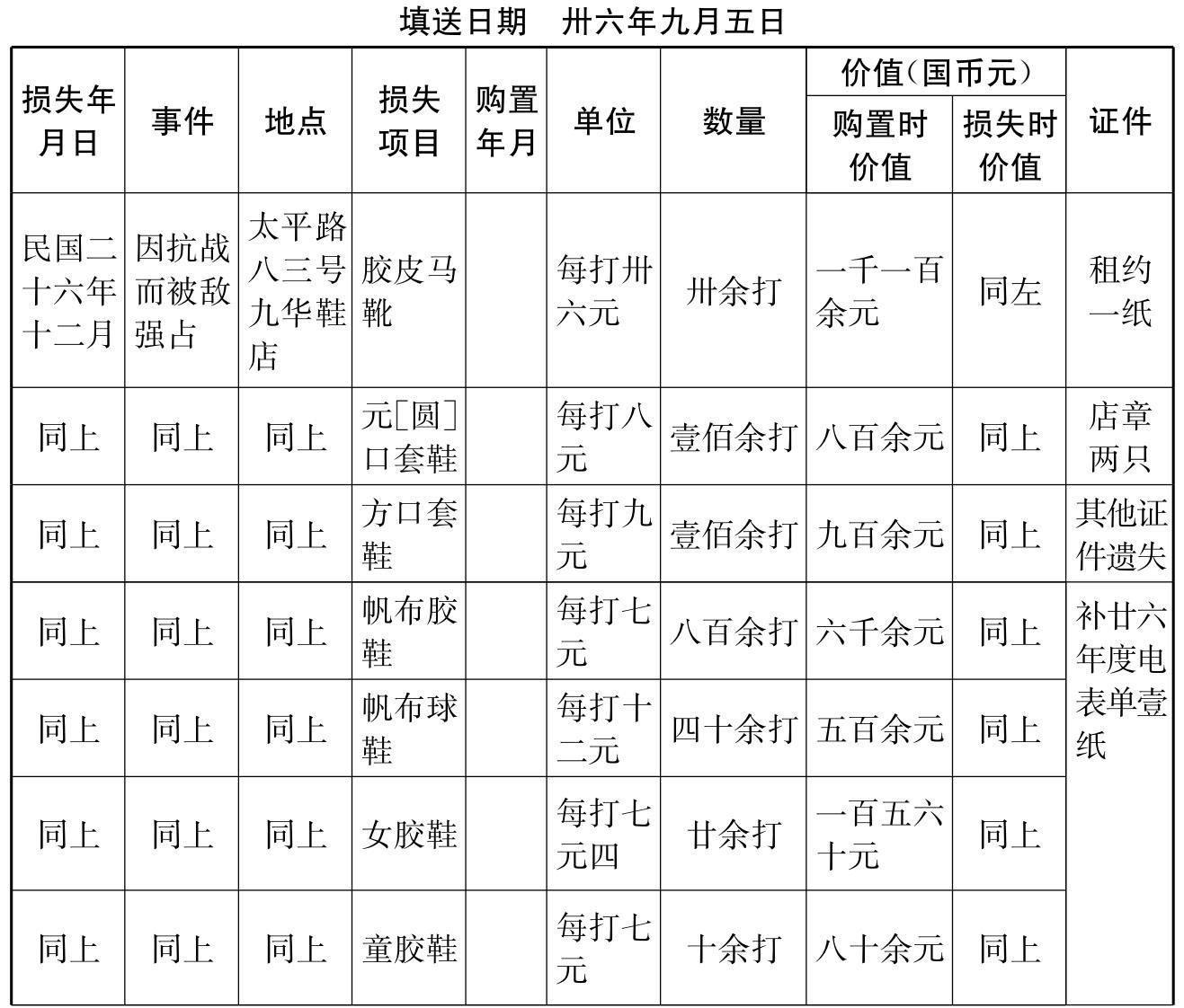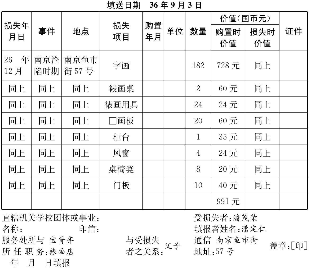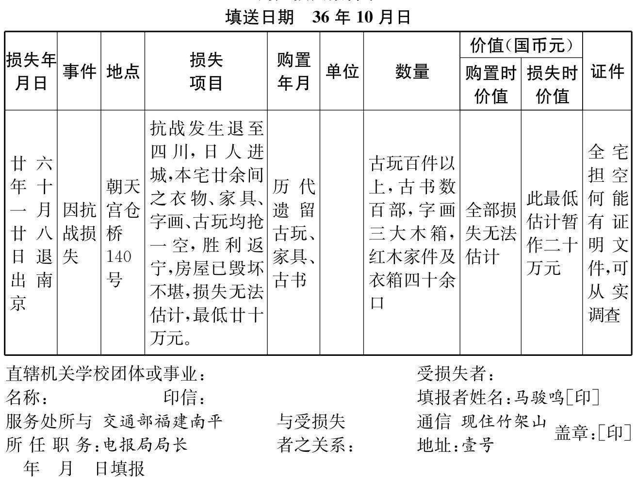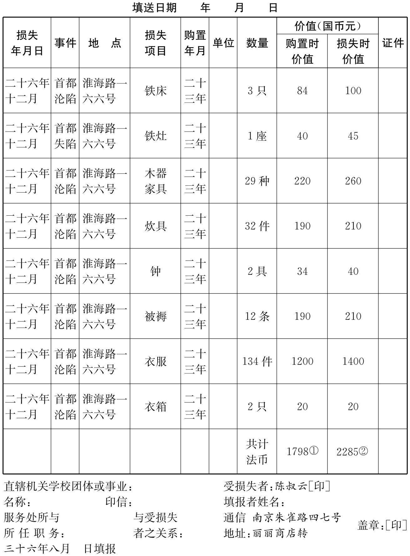 ② 本格及其上面几格填写位置可能有误,疑为“损失时价值”。原档如此。