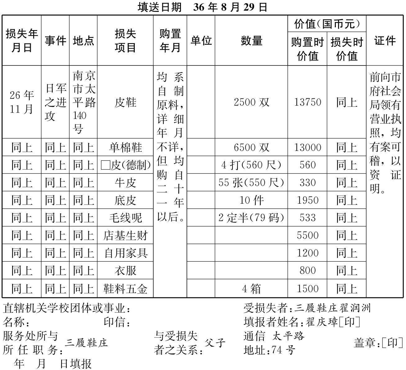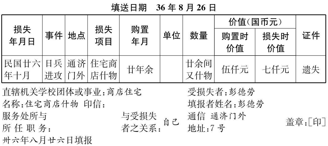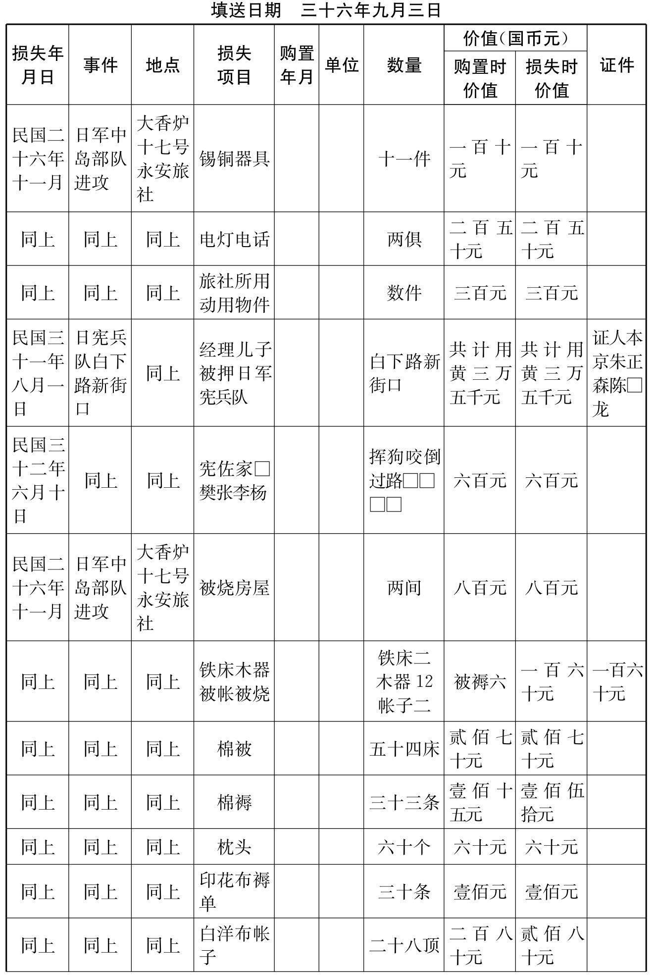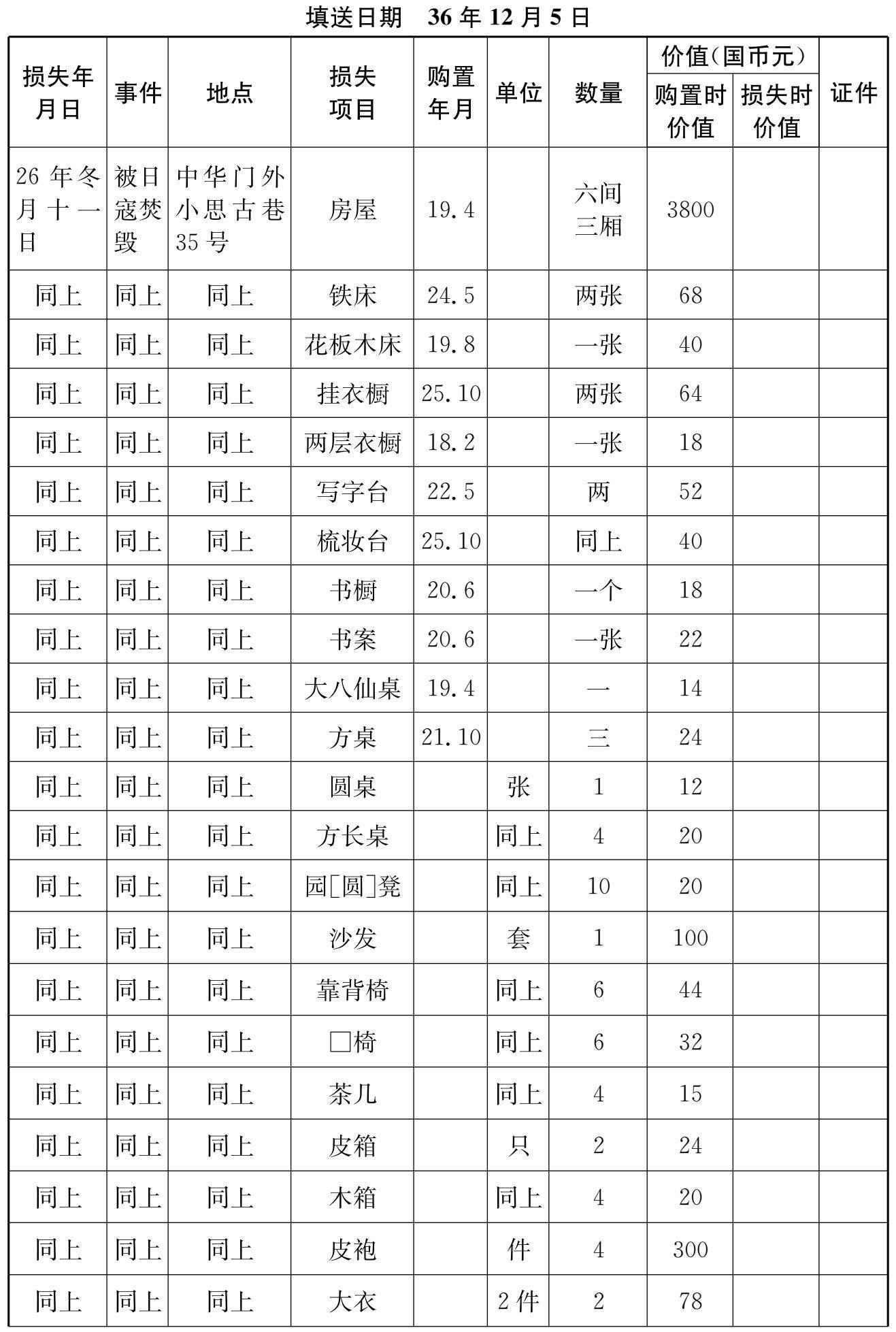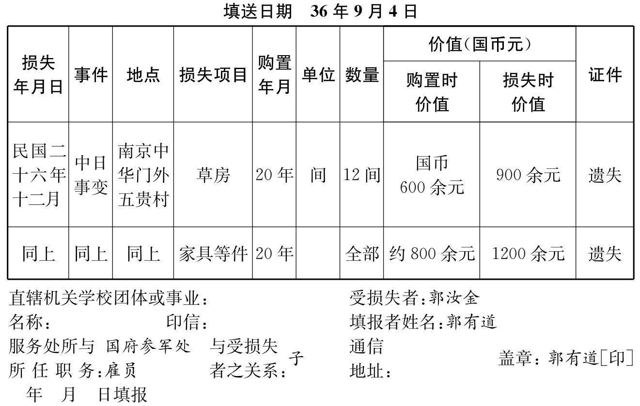 ② 本格及其上面几格填写位置可能有误,疑为“损失时价值”。原档如此。