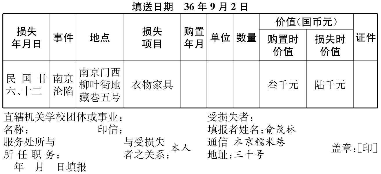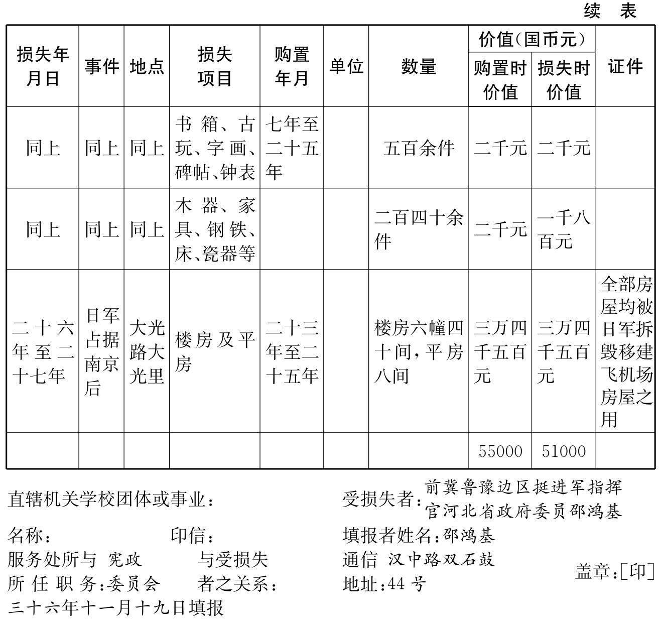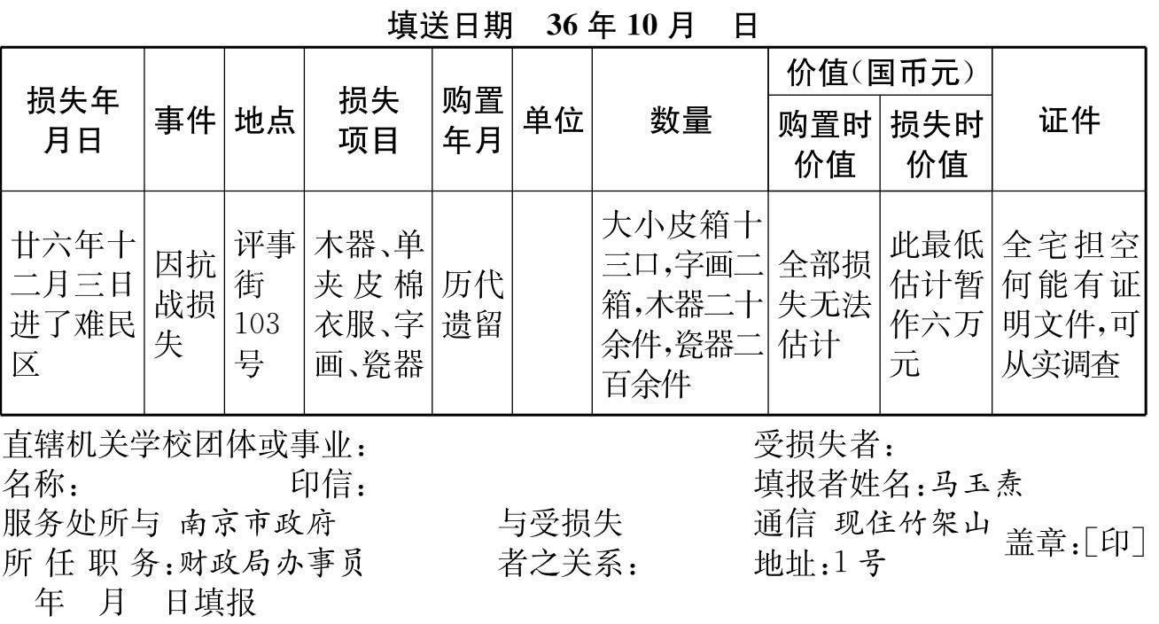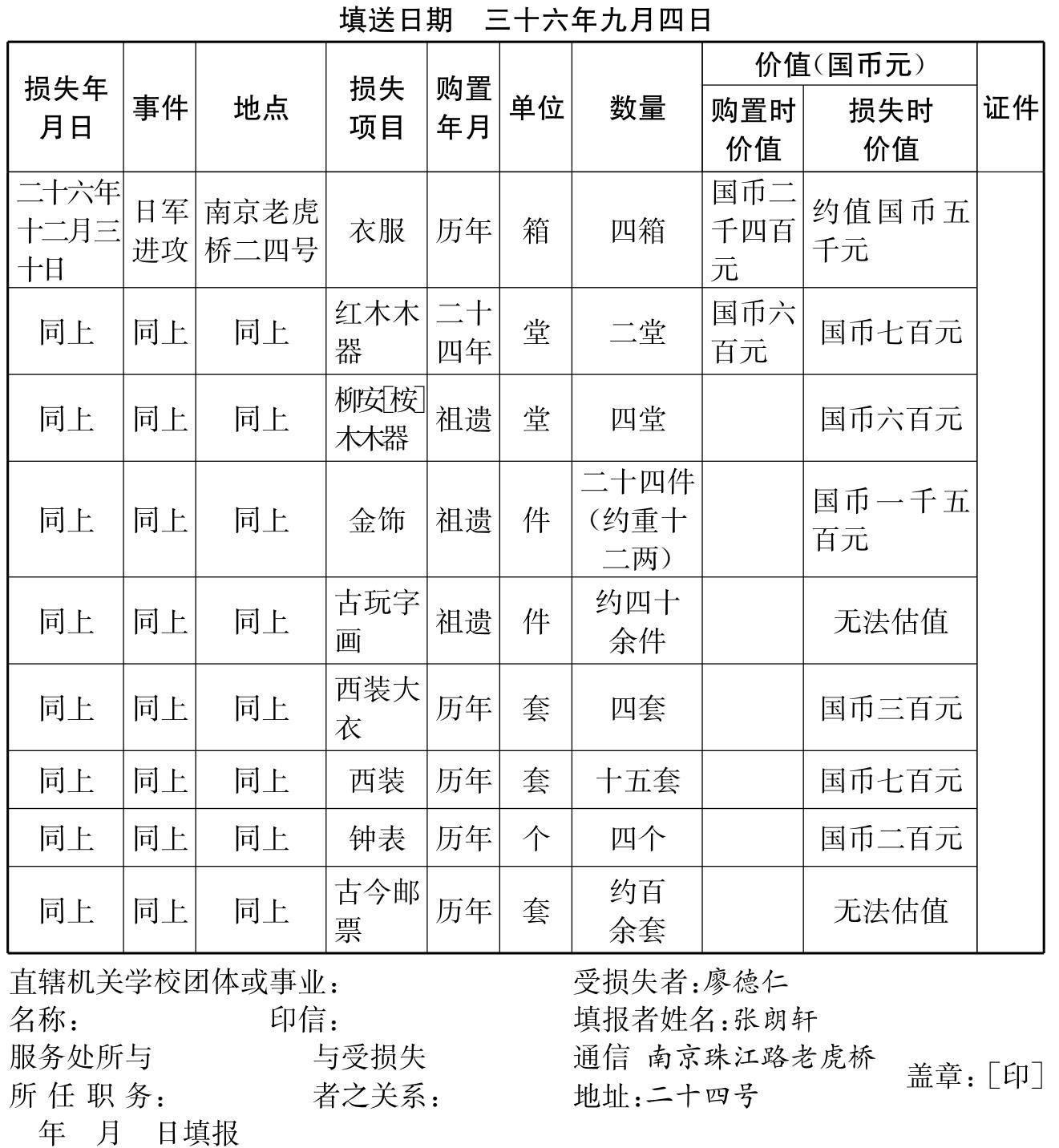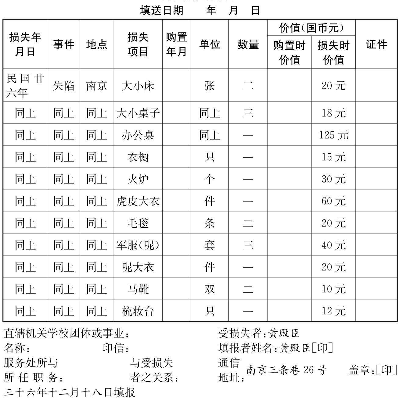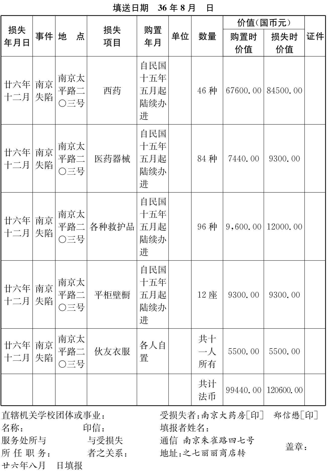 ② 本格及其上面几格填写位置可能有误,疑为“损失时价值”。原档如此。
