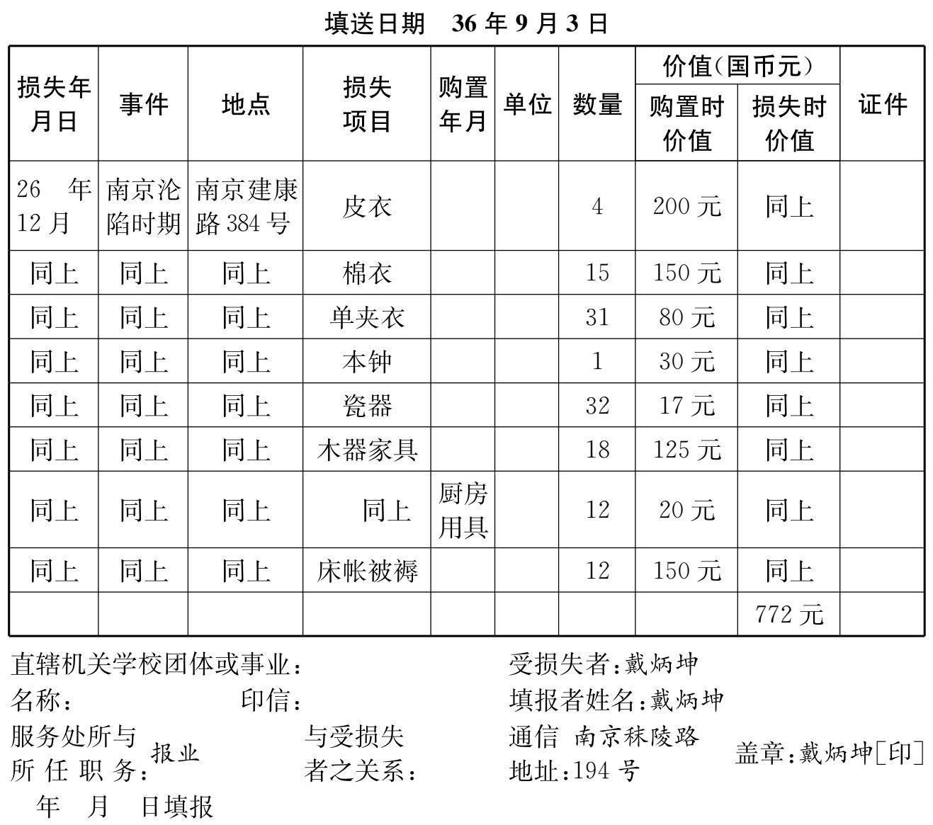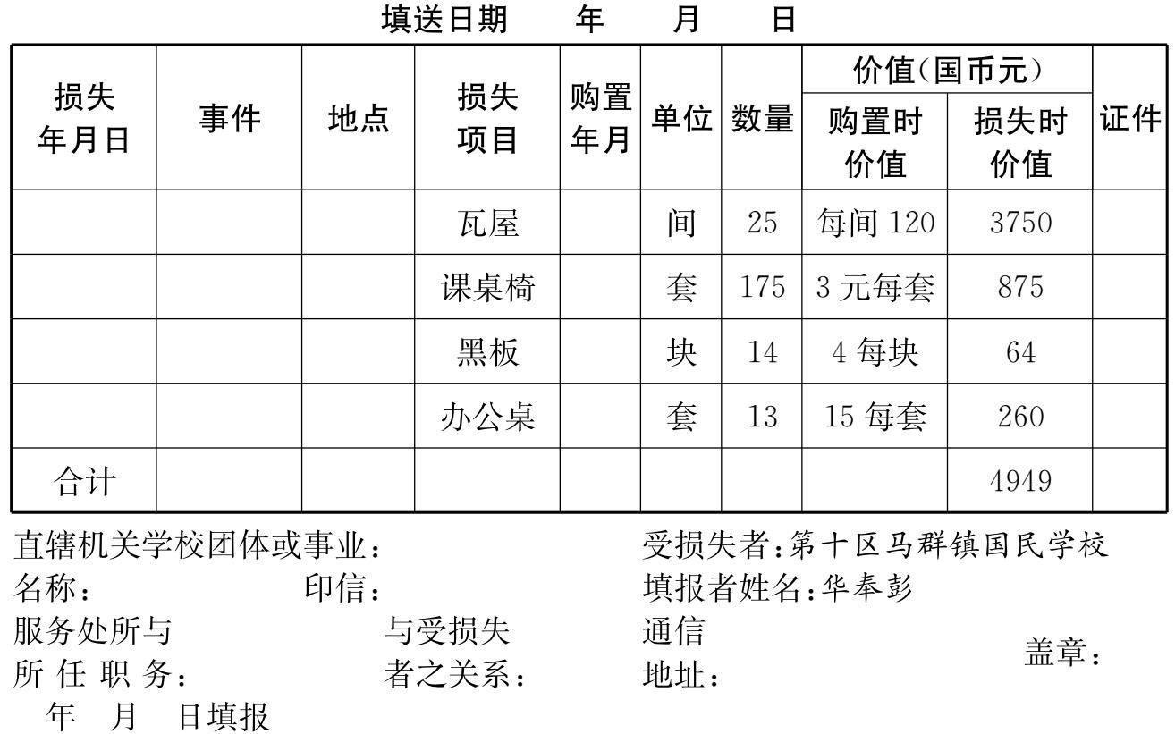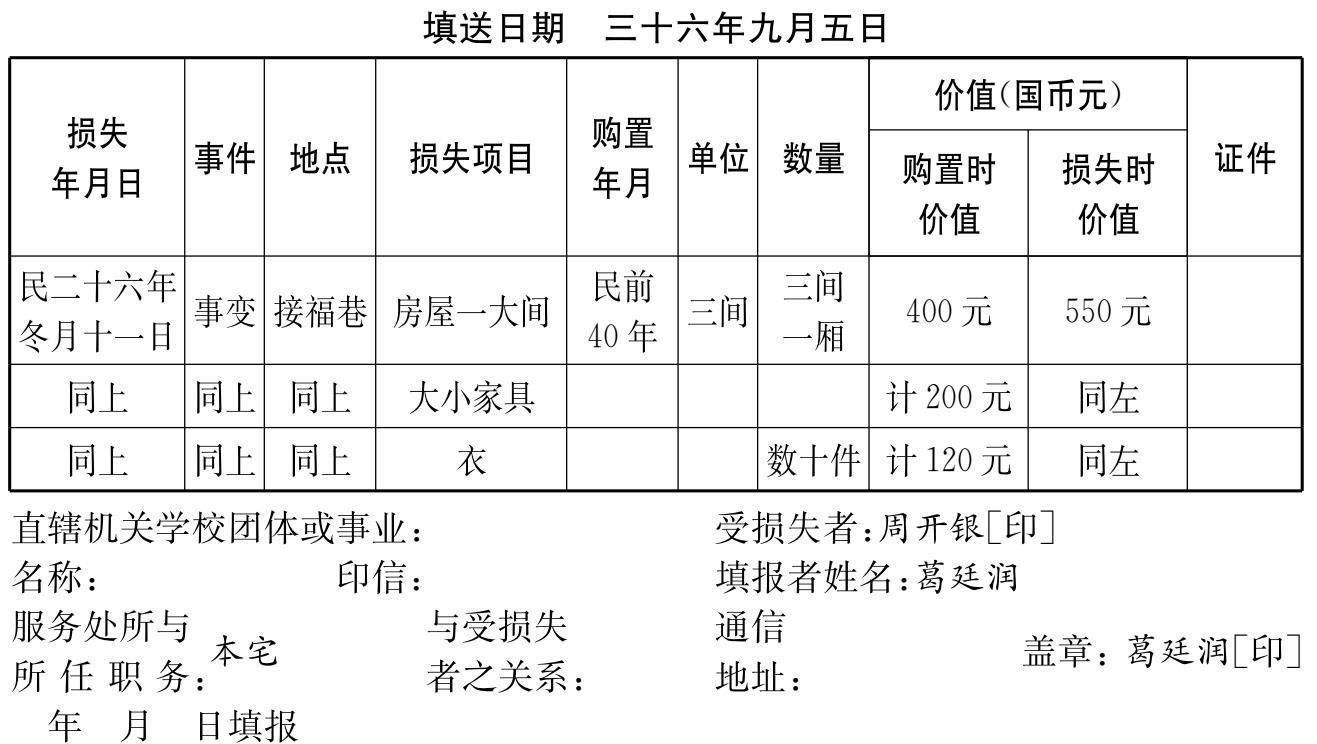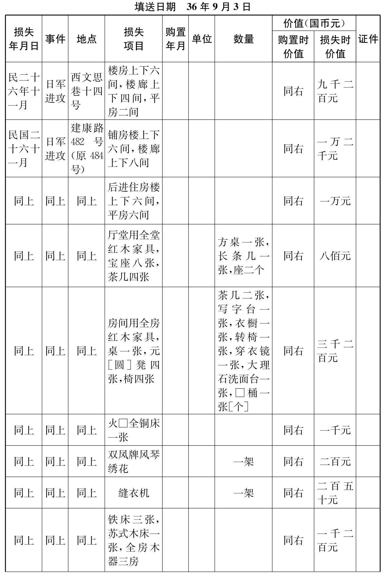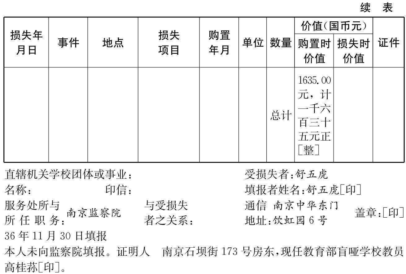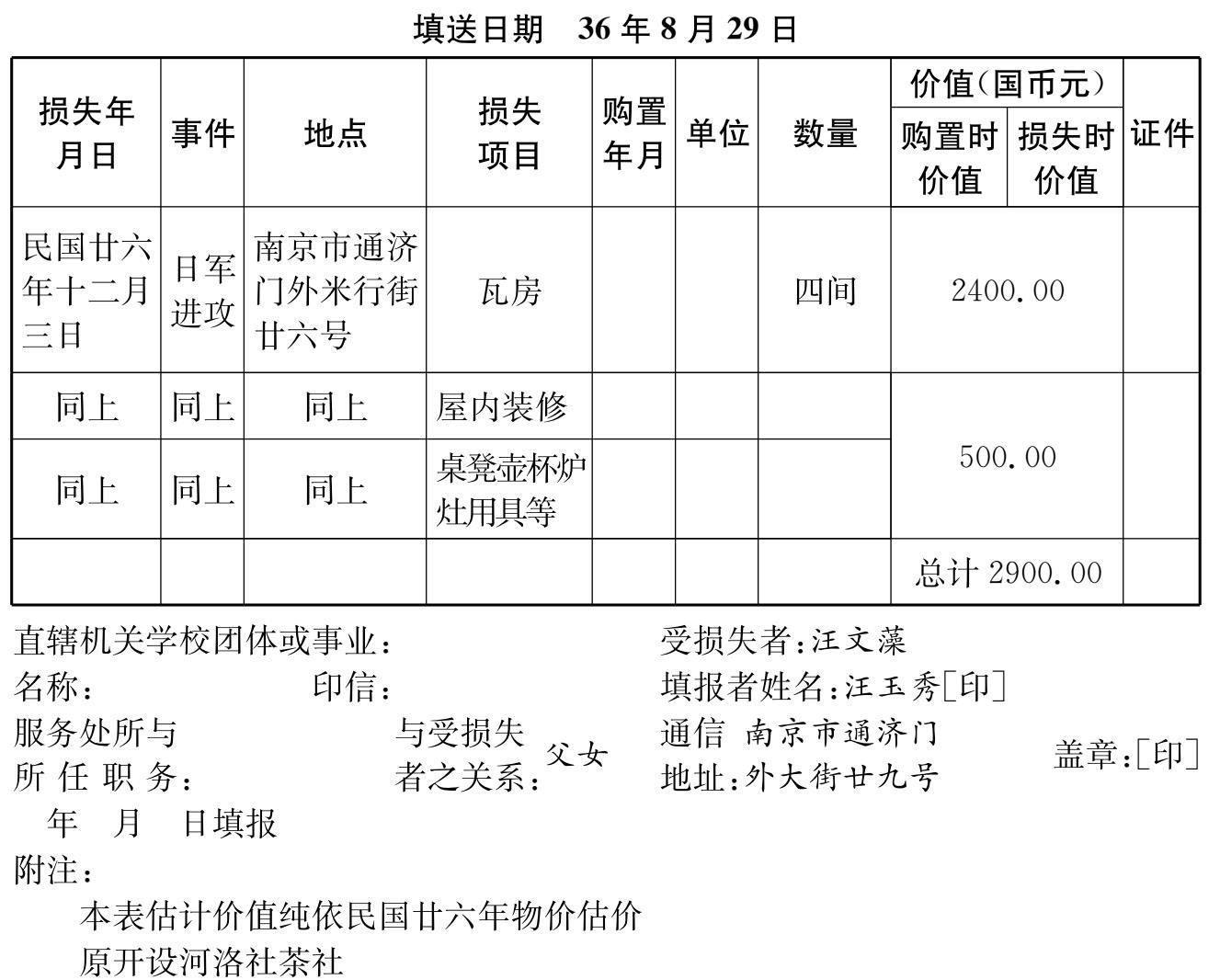 ② 本格及其上面几格填写位置可能有误,疑为“损失时价值”。原档如此。