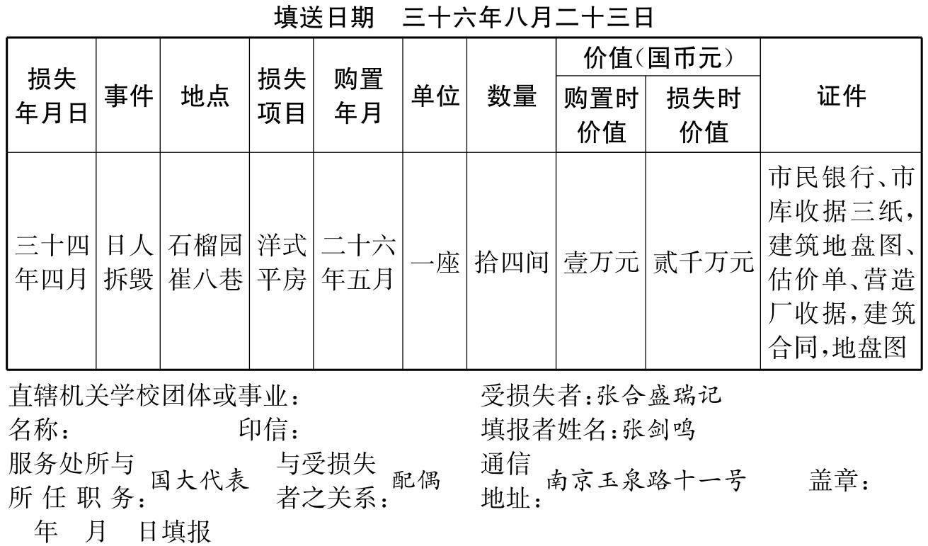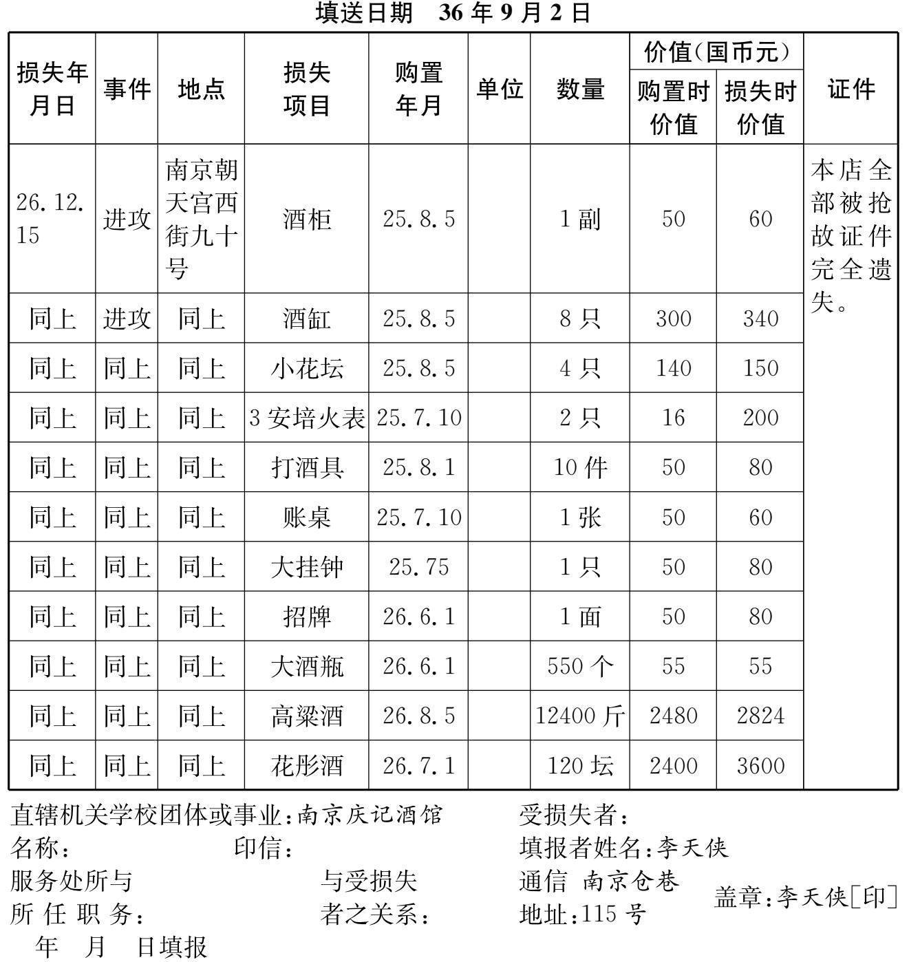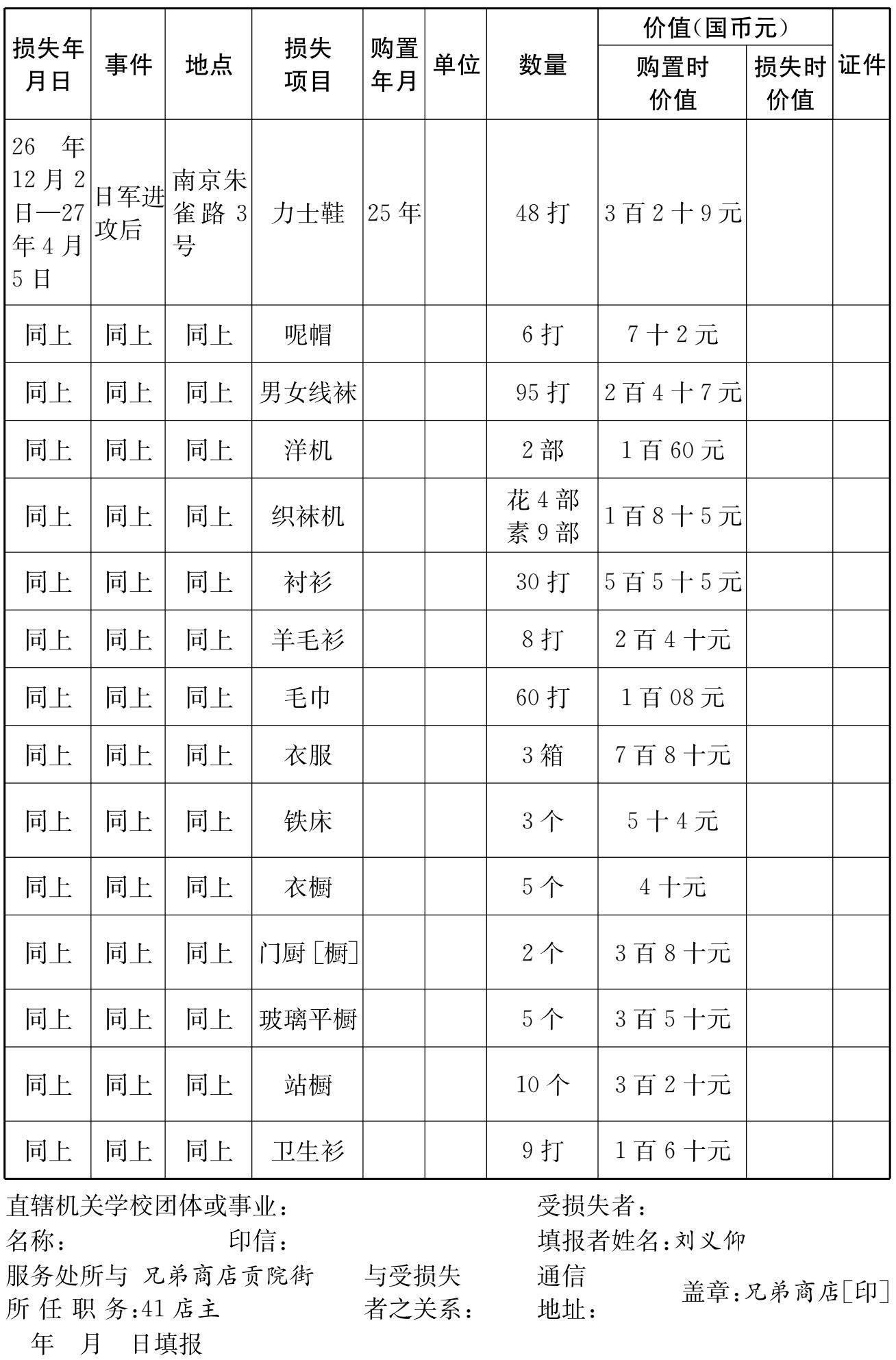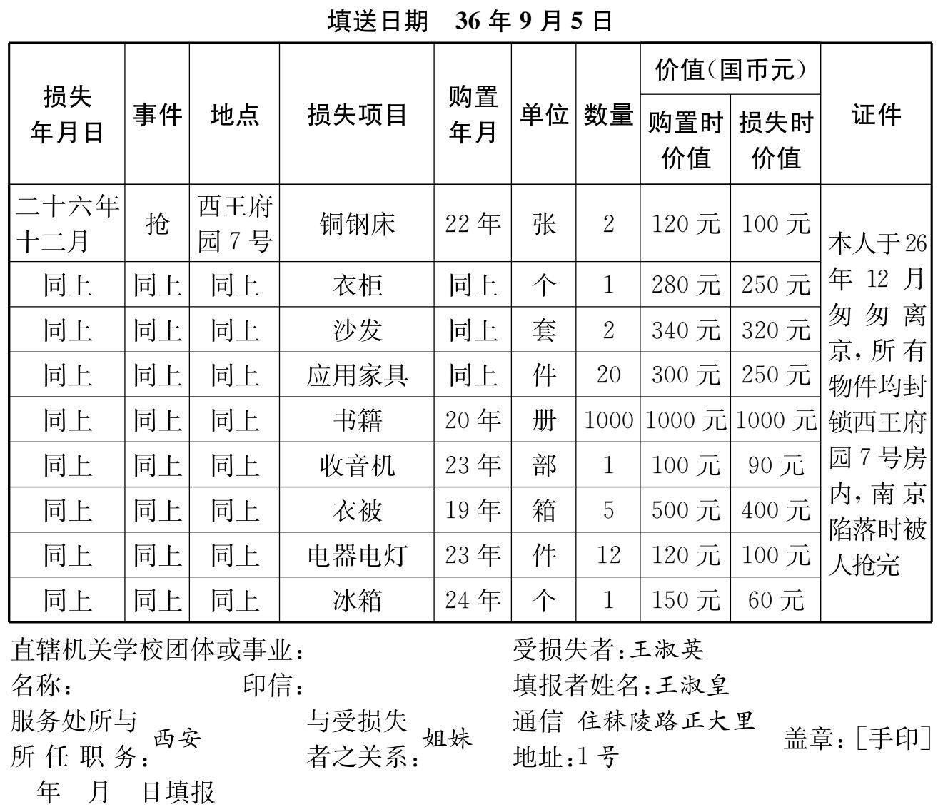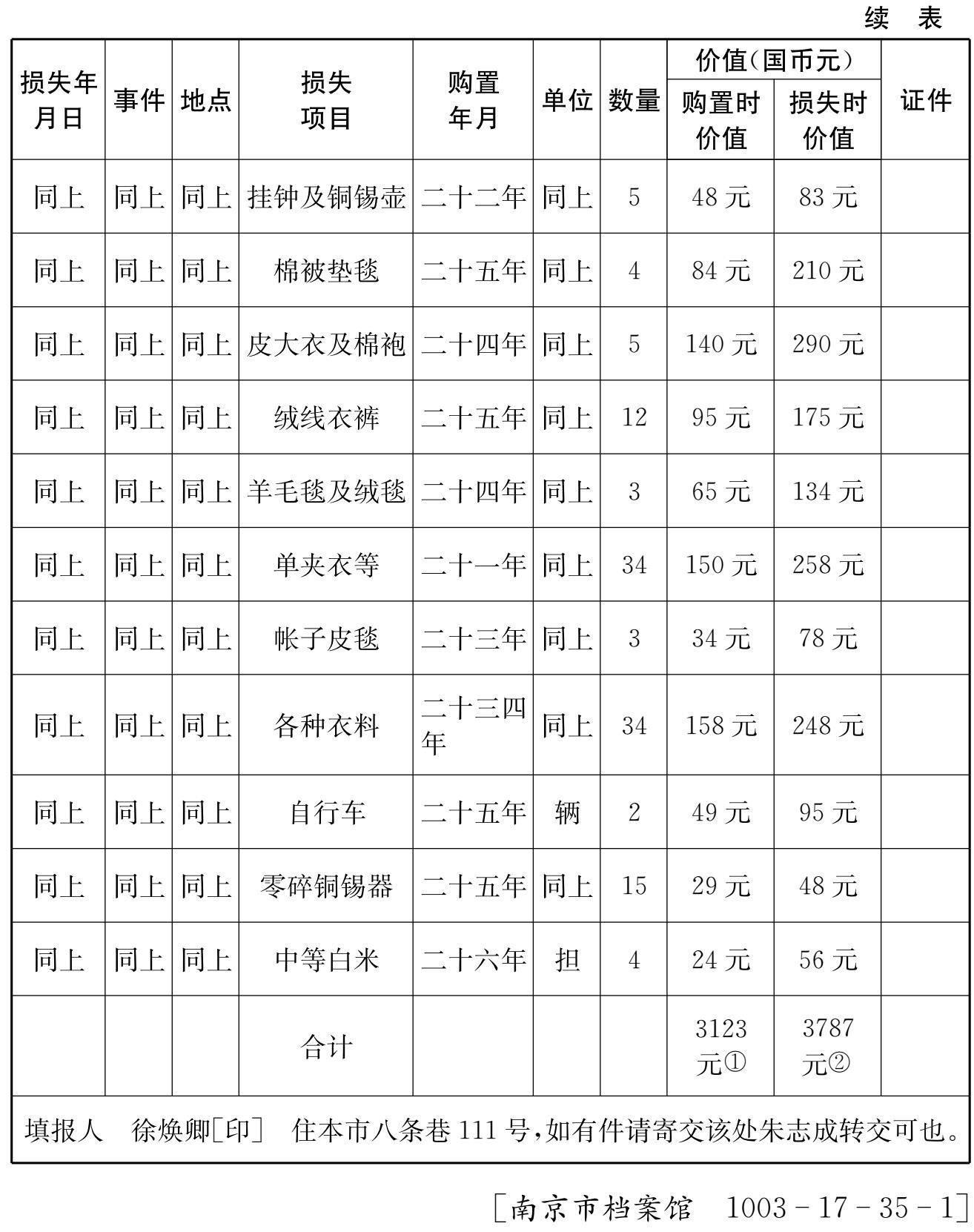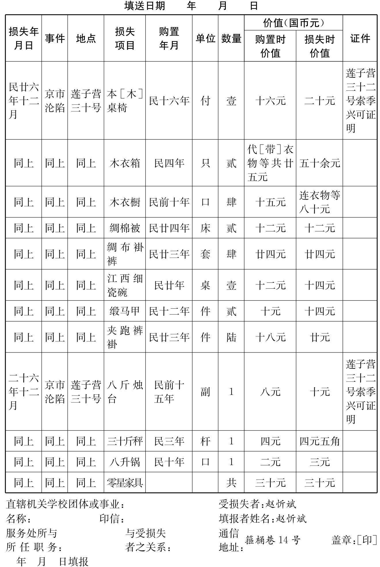 ② 本格及其上面几格填写位置可能有误,疑为“损失时价值”。原档如此。