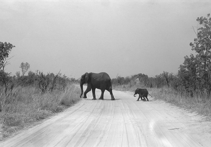 树林已经被大象占据,树枝折断的声响此起彼伏,象群往大路上跑,轰隆轰隆扬起漫天尘土,有一度与急冲的我们非常接近。我们连忙踩刹车,在大象身后不远处屏息等待它们过马路。