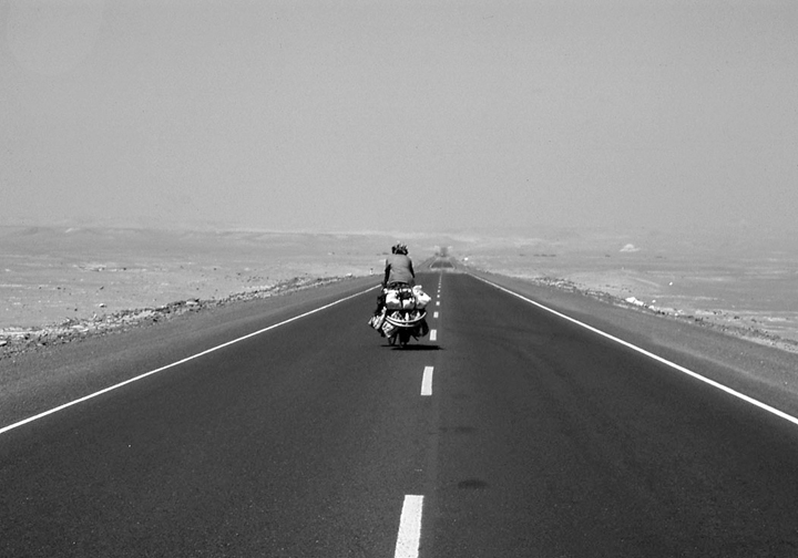 那家伙从皮夹克口袋里掏出手枪,往这边冲过来,一手抓住我的衣领,枪口抵着肚子,传来一阵冰冷的触感。从另一个地方跑出两个人,把我带进沙漠深处推倒在沙地上,一连踢了我好几脚,再用绳子绑起我的双手双脚。之后,三人把我的行李全装上不知道事先藏在哪儿的车子,扬长而去,只留下我和自行车在沙漠中。