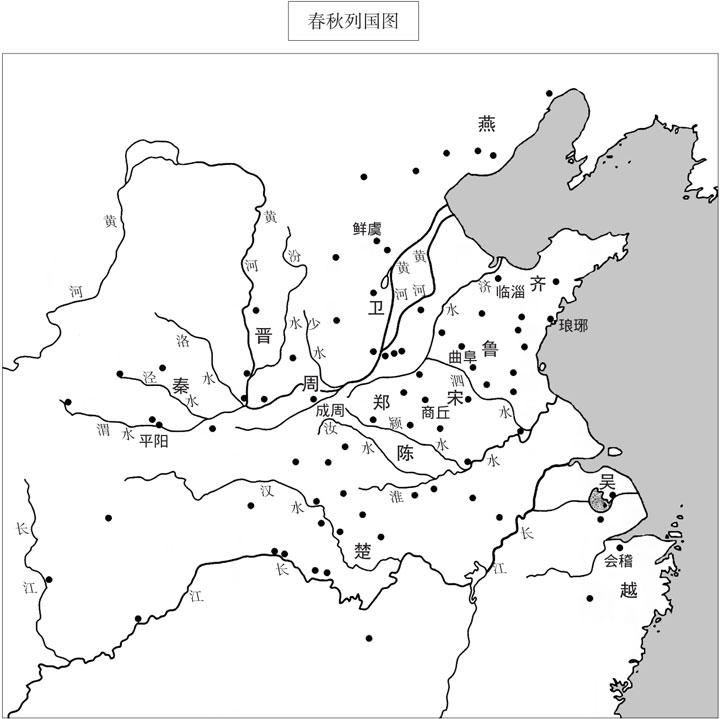 · 表示春秋时各国的都城。各都城位置是根据谭其骧主编的《中国历史地图集》第一册(中国地图出版社,1982年)标注的。