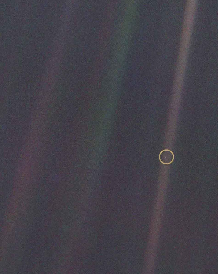 关于这张照片,卡尔·萨根在一本名叫《暗淡蓝点》的科普书里这样写道:“再看看这个点吧。它就在那里。那就是我们的家,我们的一切。在它上面,有你爱的、认识的和听说过的每一个人。历史上的每一个人,都在它上面度过了自己的一生。所有的欢乐和痛苦,所有言之凿凿的宗教、意识形态和经济思想,所有的猎人和强盗,所有的英雄和懦夫,所有文明的创造者和毁灭者,所有的皇帝和农夫,所有热恋中的情侣,所有的父母、孩子、发明者和探索者,所有的精神导师,所有的政治家,所有的超级明星,所有的最高领导人,所有的圣徒和罪人,从人类这个种族存在的第一天起——全都在这粒悬浮在太阳光中的尘埃上。”