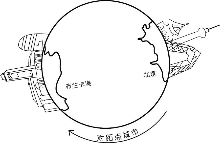 我们还是从北京出发。由于这回要测量的是整个地球的大小,上次实验的飞行路线就不能用了,因为它绕的并不是地球上最大的圆。这次我们需要飞到地球另一面,那个离北京最远的地方,然后再飞回来。科学上,我们把这个最远的地方叫作对跖点。而北京的对跖点是阿根廷一个港口城市,名叫布兰卡。