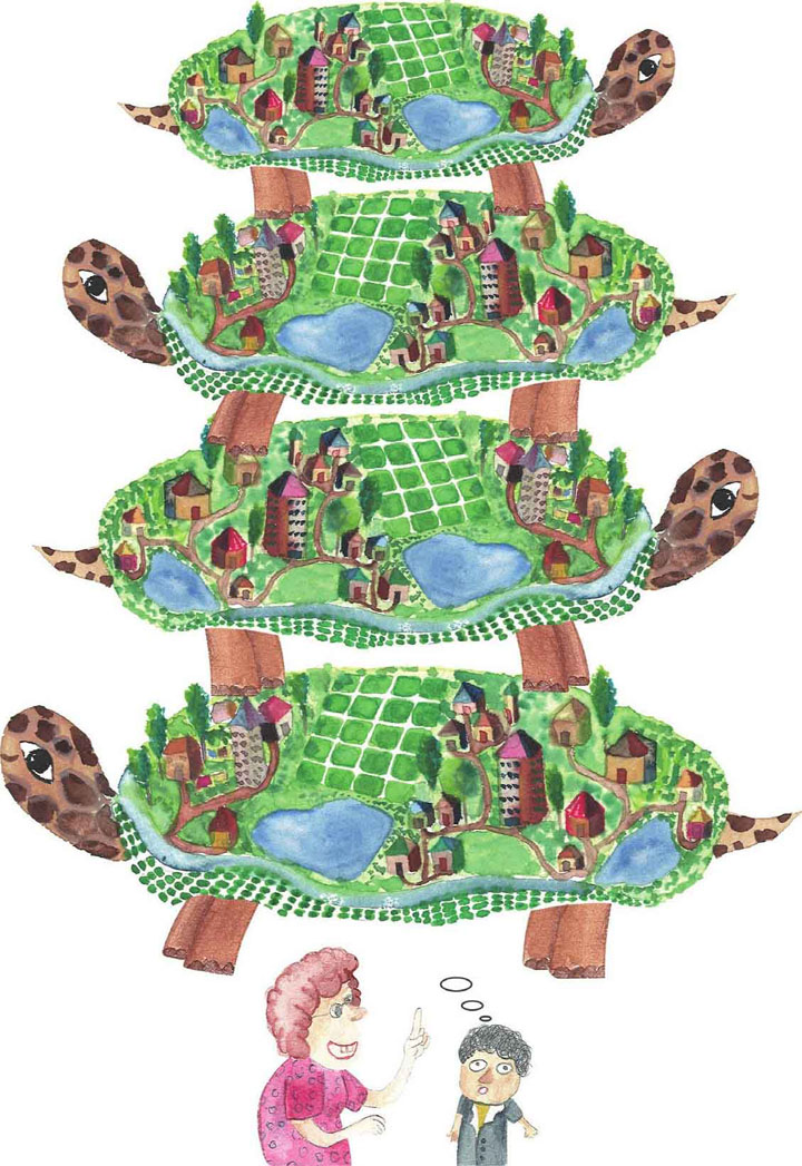 再比如说,古印度人认为,大地被驮在四头大象的背上,而四头大象又站在一只大海龟的背上。关于这个传说,还有一个好玩的故事。著名科学家罗素曾做过一个描述我们所生活的这个世界的演讲。演讲结束之后,一个坐在后排的老妇人站起来,大声说:“你完全是在胡说八道!大地其实是被驮在一只大海龟的背上的。”罗素很有涵养地问:“那大海龟又站在什么上面呢?”老妇人答道:“你确实很聪明,年轻人。不过那是一只驼一只,不断驼下去的海龟塔。”