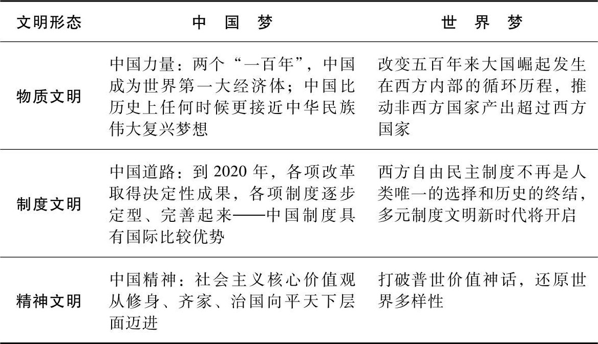 综上所述,可将中国梦及中国梦与世界梦的关系进行文明解读,如下表: