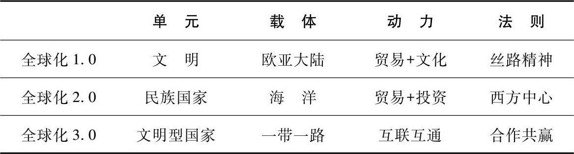 如果我们把作为古代东西方贸易与文明交流之路的丝绸之路称为“全球化1.0时代”,其单元是文明,载体是欧亚大陆,动力是贸易、文化,遵循“和平合作、开放包容、互学互鉴、互利共赢”的丝路精神;近代西方开创的全球化称为“全球化2.0时代”,是以民族国家为单元,通过海洋实现全球贸易、投资扩张,确立西方中心世界;那么,“一带一路”是21世纪的跨洲际合作倡议,不只是打通历史上中断的丝绸之路,而是借助丝绸之路的历史概念,开创“全球化3.0时代”:秉承“万物互联”,运用3D打印机、大数据和智慧城市,推动EWTO进程,开发和应用包容性技术——改变传统技术让强者更强、弱者更弱的状态;创新和实施包容性制度安排——推动国际贸易、投资规则更加公正、合理、包容;开创包容性全球化——实现持久和平、共同繁荣的千年梦想。因此,“一带一路”旨在圆梦欧亚大陆互联互通的百年憧憬,携手开创“全球化3.0时代”。
