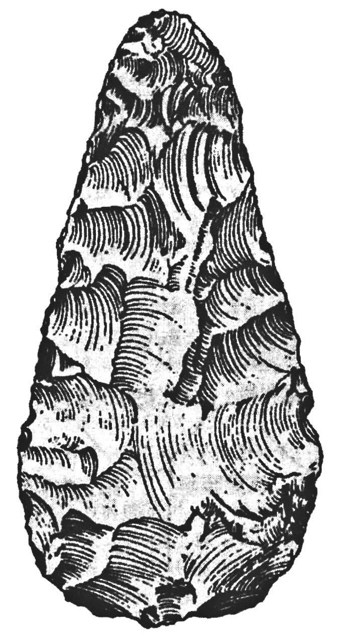 我们通过考古挖掘出了许多石质工具(法国的考古挖掘活动最多)。挖掘出来的那些石器表明石器时代的猎人们在学会制作石器之后的几十万年是如何继续进化的。我们通过研究收藏在欧美博物馆中的石器,能够发现早期人类是怎样从削制粗陋的石器逐渐进化到制作非常完善的石头工具的(图3)。最具代表性的石器就是“拳斧”,它被用于当时的一切活动中。“拳斧”长8英寸至10英寸,下面宽上面窄,刀刃锐利,能够很简单地切割断枝,还能制作钻木取火的装置,同时还能制作棍棒。它之所以被称作“拳斧”,主要是因为在当时猎人们常常握着它窄细的一头,那时他们还不会安装把手。在欧洲以及欧洲之外的其他地方都发现过这种“拳斧”。可以说,这是我们迄今所发现的最早的人类制作的石器工具。