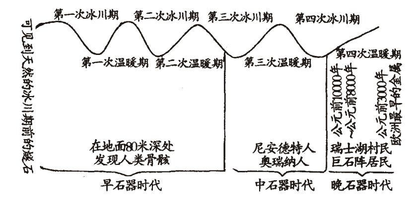 人们注意到在石器时代后期,人们赖以生存栖息的森林开始失去温暖的热带气候的保护,即便是现在的科学家也无法解释使热带气候渐渐变冷的原因。冰川正在不断地向南移动。阿尔卑斯山的山顶以及北极地区现在还是常年积雪。在那个时代,南下的北极冰川渐渐地覆盖了英格兰,甚至还覆盖到了泰晤士河南部。阿尔卑斯山的冰川则顺着罗纳河谷一路向南,一直到了如今的法国里昂地区。北美南部的冰川则以漂砾线为基准,“漂砾”就是我们如今所熟悉的砾碛或砾石堆。在冰川推动下砾碛开始向南移动,形成了我们现在所看到的砾碛线。在南部长岛可以看见这样的,西部的砾碛可以在俄亥俄州和密苏里州的河谷中看到。