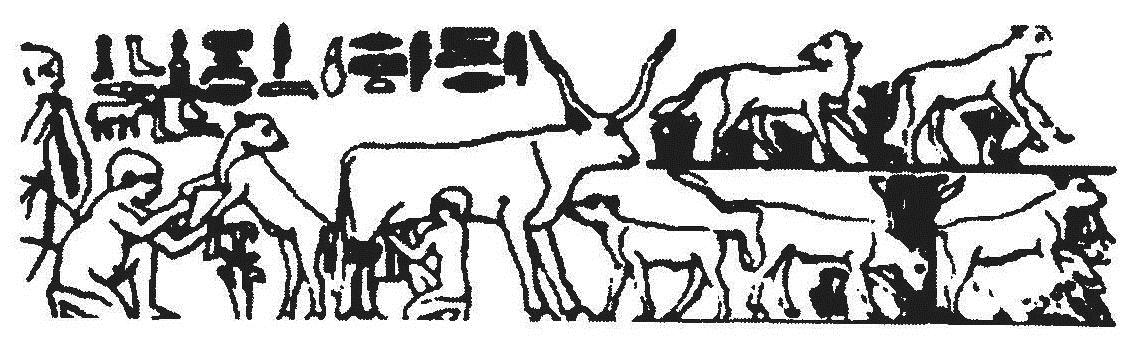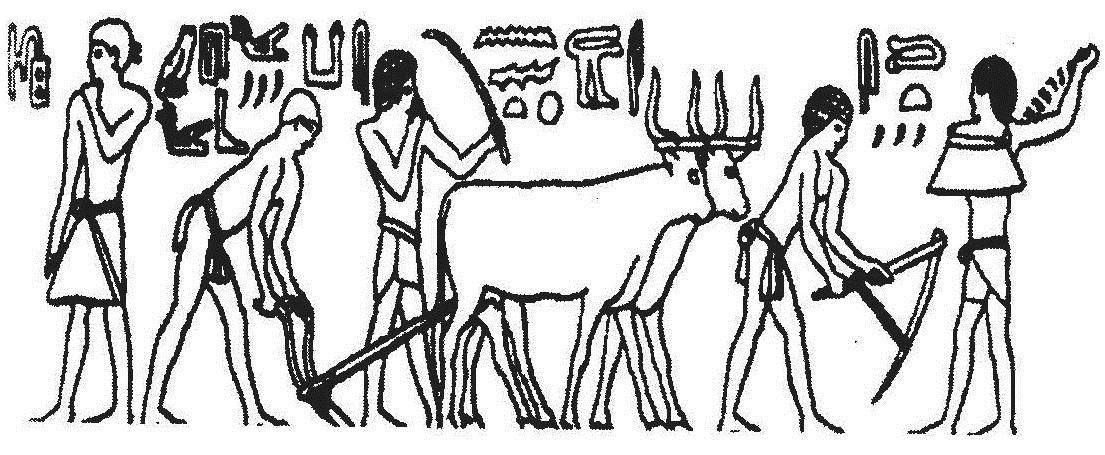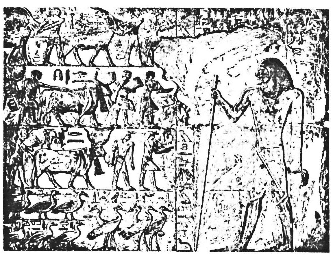 我们再去仔细观赏那些壁画就能看到,壁画中的显要位置被一个大个子贵族占据着(图45),很明显他是这个庄园的主人。他直挺挺地站在那儿,在查看他远处的农田以及农夫的劳作情景。图46为我们展现出的是我们已知的最古老的农业生产景象。在图45、图47中我们还能看到那时的牧群以及草地上吃草的健壮的畜牧群,还有被牵着拴在桩上挤奶的母牛,当然还有正在拉犁耕地的公牛。这些家畜的一个重要作用就是用来驮运物品。我们没有在金字塔时代的墓穴中发现马的图像,原因就是处在金字塔时代的埃及人还没有驯养过马。能够时常见到的主要是毛驴,我们可以这样设想一下:如果那个时代没有驯养驴的话,人们在收获庄稼的时候就会感到困难重重。