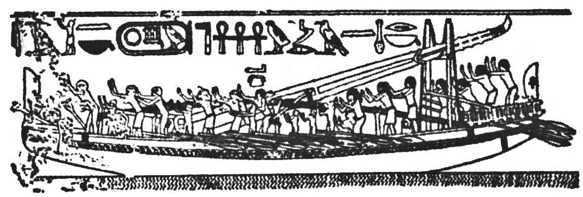 埃及在进入金字塔时代之后就处于一个非常强大的时代了,那些法老王们因为贪婪,开始将自己的手伸向其他国家,他们越过埃及边界去抢夺邻邦的财富。我们在一些一直保存到现在的浮雕上能够了解到,法老王早在公元前28世纪中叶就已经开始进行横跨地中海的商贸活动了,他们派遣船只经由尼罗河进入地中海,最后到达了腓尼基海滨。我们在图43的浮雕中能够看得出来当时的航船是什么样子的。