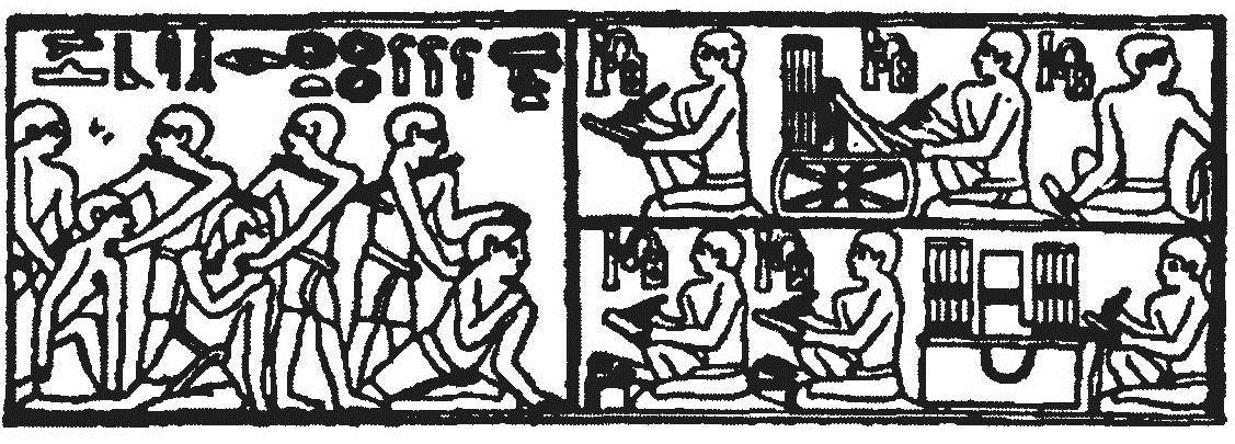 远处我们看的情景是纺织女工正从纺织机上抽出一丝纤细的亚麻纤维。仅仅凭借这个情景,我们对当时纺织品的精细程度无法做出判断。但值得庆幸的是,几块残存的亚麻布在当时一座陵墓中的木乃伊上被人们发现了。我们不禁惊讶这些皇家亚麻布的精细程度,这些亚麻布精细到要用放大镜才能将它们与丝绸区分开。我们现在用机动纺织机纺制的最好的布匹,与这些古埃及人用手工纺车纺出的织品相比,也显得极为粗糙。纺织工们正在一架织机上编织一条精美的挂毯。这些挂毯的主要作用是装饰法老的宫殿墙壁或者是用于贵族别墅屋顶花园遮阴。就是这些纺织者用他们的双手编织出上面提到的精细的纺织品。大量莎草苇在墙的另一处被我们发现了。尼罗河边的沼泽地是这些草苇的产地。造纸的原料就是这些草苇,以它们为原料制成的纸形状长而窄,且呈淡黄色。这种尼罗河纸草会被打成捆,通过我们在地中海上所见的船队,远销欧洲国家。