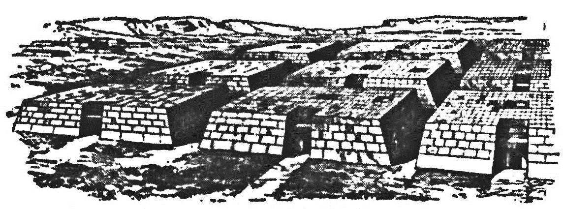 虽然这是一些极为简陋的墓穴,但是那些头脑灵活手脚灵巧的工匠就隐藏在其中。他们发现,石灰石可以用铜质工具切割成方块。相比于那些松软的土坯,用这种石块垒筑的墓墙要更加坚固。以我们现在所了解的来看,这些石头建筑是最早的(图40-3)。虽然,从严格的意义上来说,并不能将它们归为建筑物,原因就在于虽然这种砖石砌的建筑主体的地下部分像地辔墙一样,但我们所见到的建筑物的地上部分仍然由土坯建成(图 40-4)。