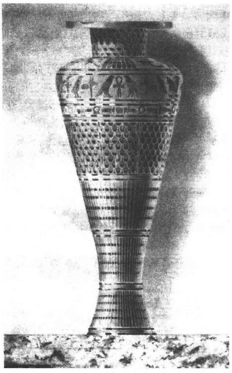 这些花瓶是金质的,呈现黄色,瓶子上镶嵌着青金石,呈现出蓝色,这些都是由埃及金匠制造出来的。