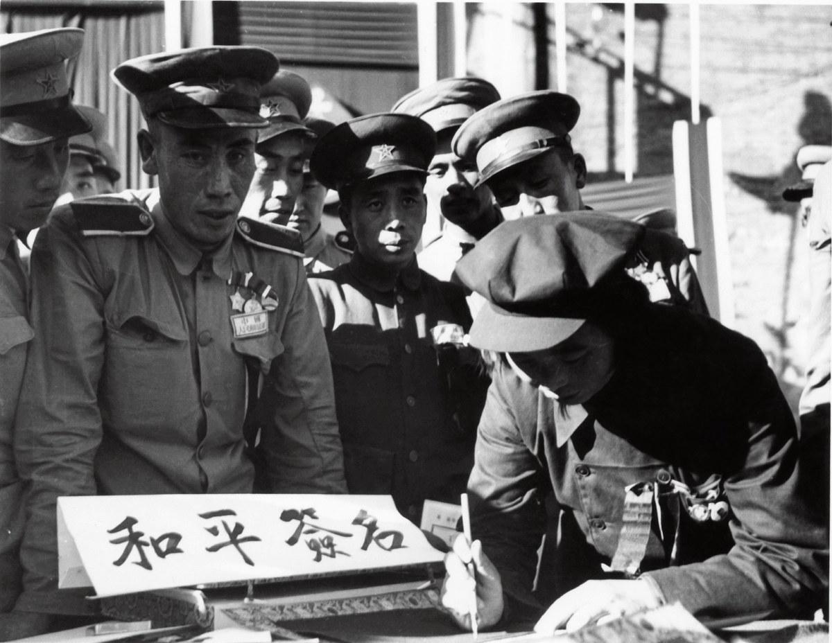 1950年10月,我正在北京采访全国战斗英雄代表会议。闭幕式上,针对美国武装侵略朝鲜、霸占中国领土台湾,严重威胁我国安全的情况,英雄们举行了庄严的和平签名仪式——在斯德哥尔摩宣言上写上自己的名字。会场变成了出征誓师大会,会议一结束,他们便随部队登上火车,奔赴战火纷飞的朝鲜战场。