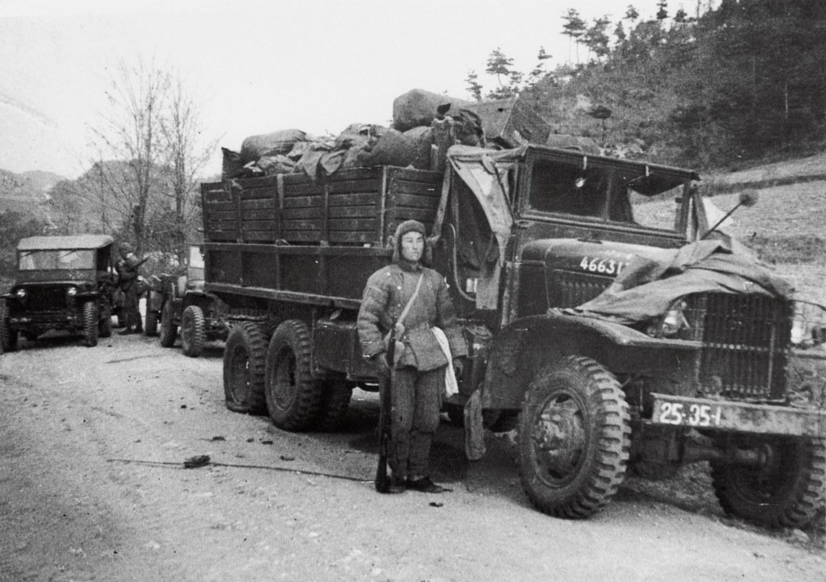 1950年11月中旬,在一、二次战役中缴获的满载物资的美军汽车。