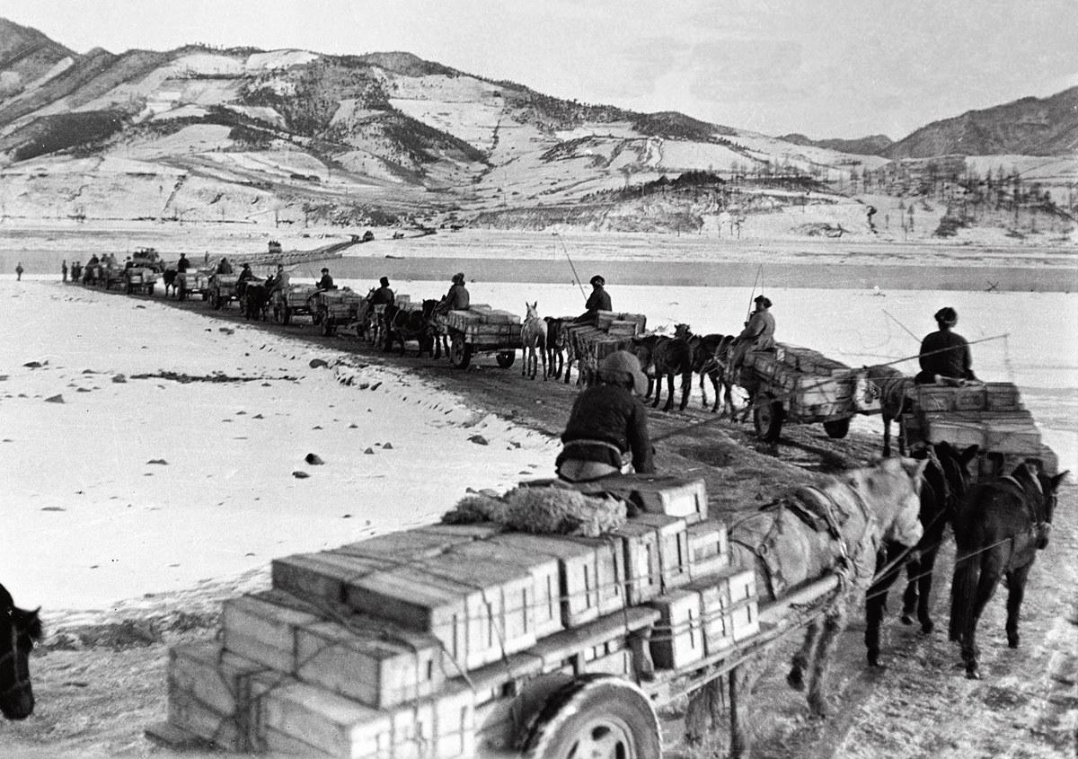 1950年10月底,东北人民赶着马车,通过鸭绿江浮桥向朝鲜前线运送弹药和军需物资。