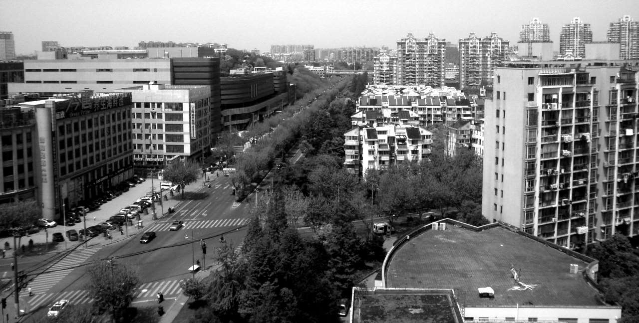 图1-17上海街景。 这张照片里保留了许多单眼线索。马路两边的树和建筑物给出透视线索。近处的建筑物和树木比远处的大。远方大楼模糊不清。当然还有远方的建筑物被近处的建筑物挡住。