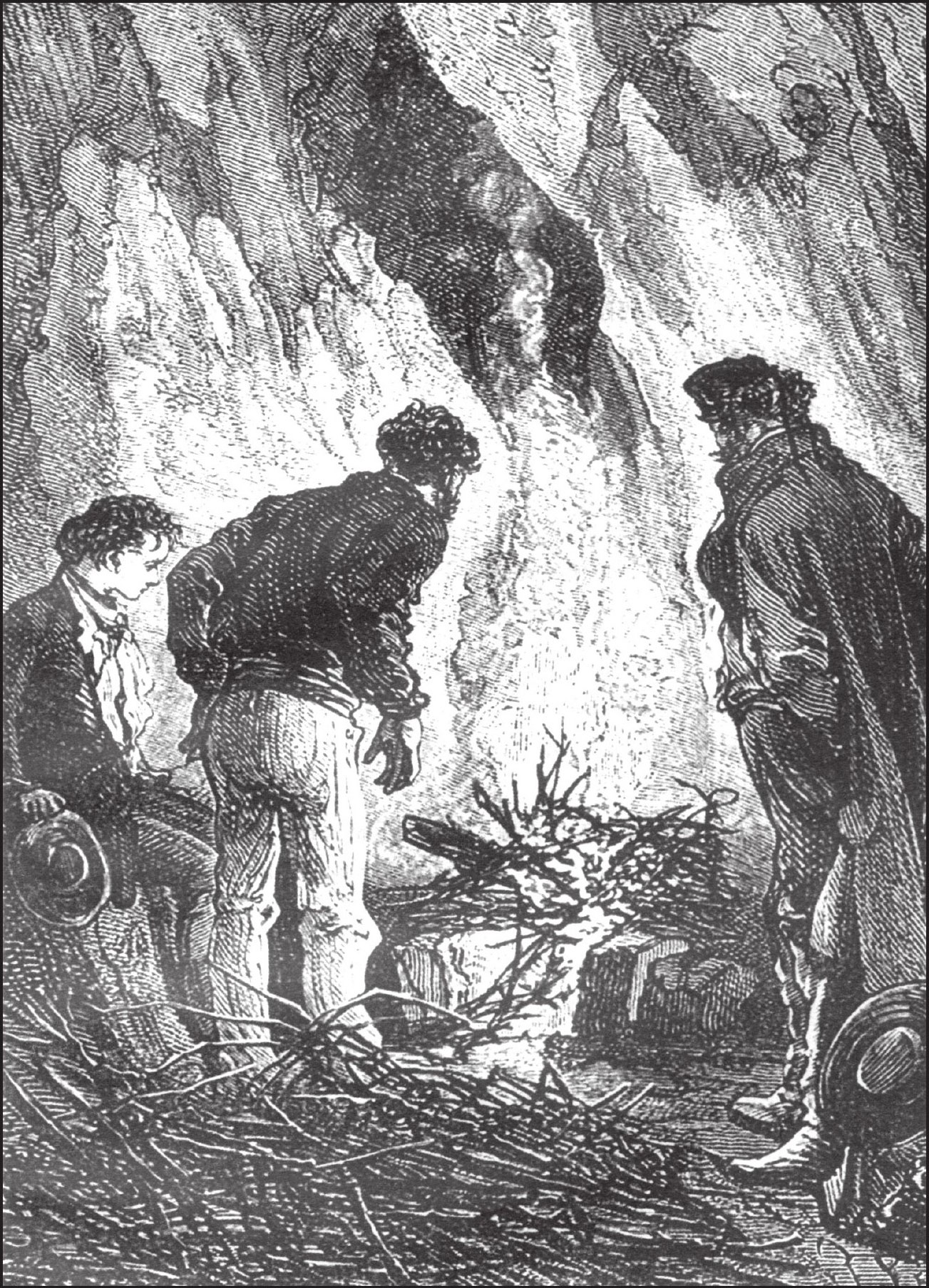 他们在留下的狭长通道的出口处安放了几块又平又宽的石头,出口在左侧第一个通道的最后边。只要烟不把热量带到洞外,就可以让洞内保持合适的温度。他们把木柴贮存在其中的一间屋子里,水手在做火炉用的石头上放了几大块木柴,又放些细碎的木柴,混在一起。