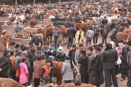 随着社会主义市场经济的不断发展,市场在资源配置中的决定性作用充分体现出来。图为2016年3月27日农户在贵州省威宁县小海镇牲畜交易市场选购耕牛。