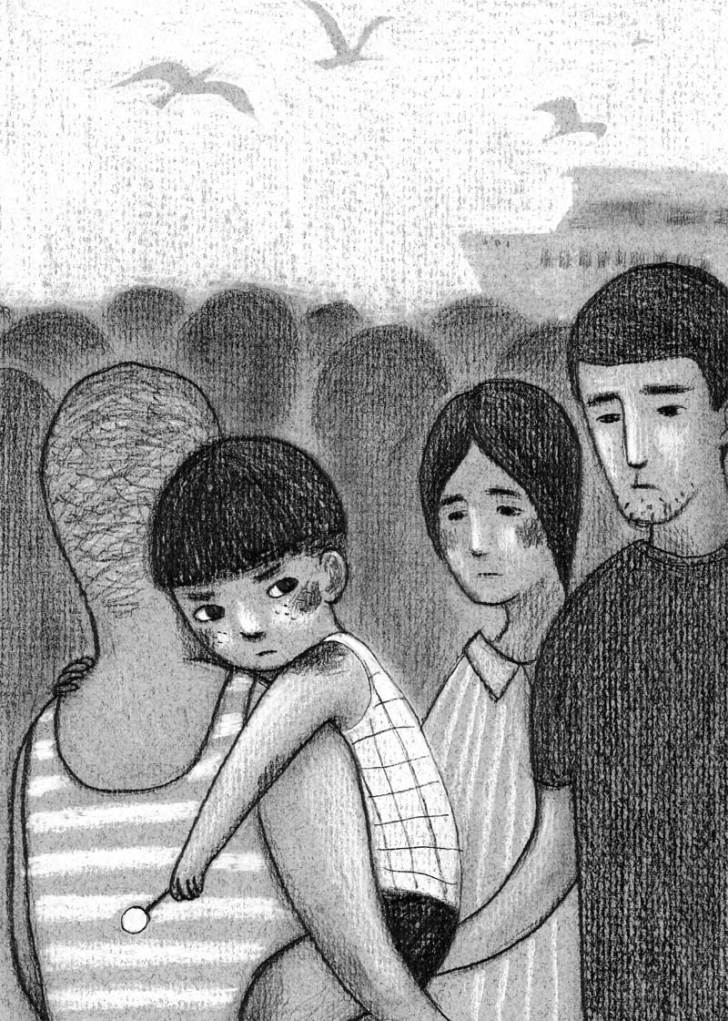 奶奶把父母送到了里院的门洞口,站在风中久久瞩望着。爷爷又带着俺坐公共汽车送父母到了轮渡口。买了船票后,俺听父亲说:“下次一定把多多也带来。”爷爷说:“这次怎么不带来?她一个人留在家里能行?”母亲解释道:“有人会关照她,再说她也放不下少少。”俺听明白了,在父母那个家里,还有多多和少少。爷爷问:“多多该上学了吧?”母亲说:“还得过一年。”爷爷说:“你们那里有学校?来青岛上吧。”父亲说:“有——”声音拖得很长,是不要把他们生活的环境看得太糟糕的意思。这时响起了催促上船的哨子,父母就要通过检票的栅栏门了。爷爷把俺抱起来说:“圆圆,给爸爸妈妈再见。”俺望着上下翻飞的鸥鸟,没有理睬父母。爷爷几乎是恳求着又说了一遍,俺还是不理睬。父母走了。突然,母亲回身扑过来,捧着俺的脸,迅速亲了俺一下。俺神情木然,继续呆望着天空和飞鸟。