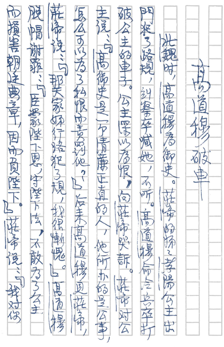 北魏时,高道穆为御史。庄帝的姊姊寿阳公主出门犯了路规,纠察卒喊她,不听。高道穆命令兵卒打破公主的车子。公主深以为恨,向庄帝哭诉。庄帝对公主说:“高御史是一个清廉正直的人,他所办的是公事,怎么可以为了私恨而责罚他?”后来高道穆见庄帝,庄帝说:“那天家姊行路犯了规,我很惭愧。”高道穆脱帽谢罪:“臣蒙陛下恩,守陛下法,不敢为了公主而损害朝廷典章,因而负陛下。”庄帝说:“我对你惭愧,你反而向我谢罪?”