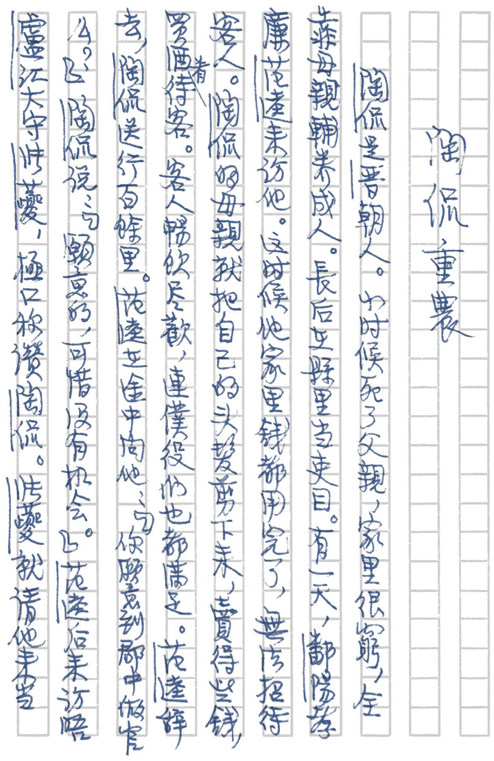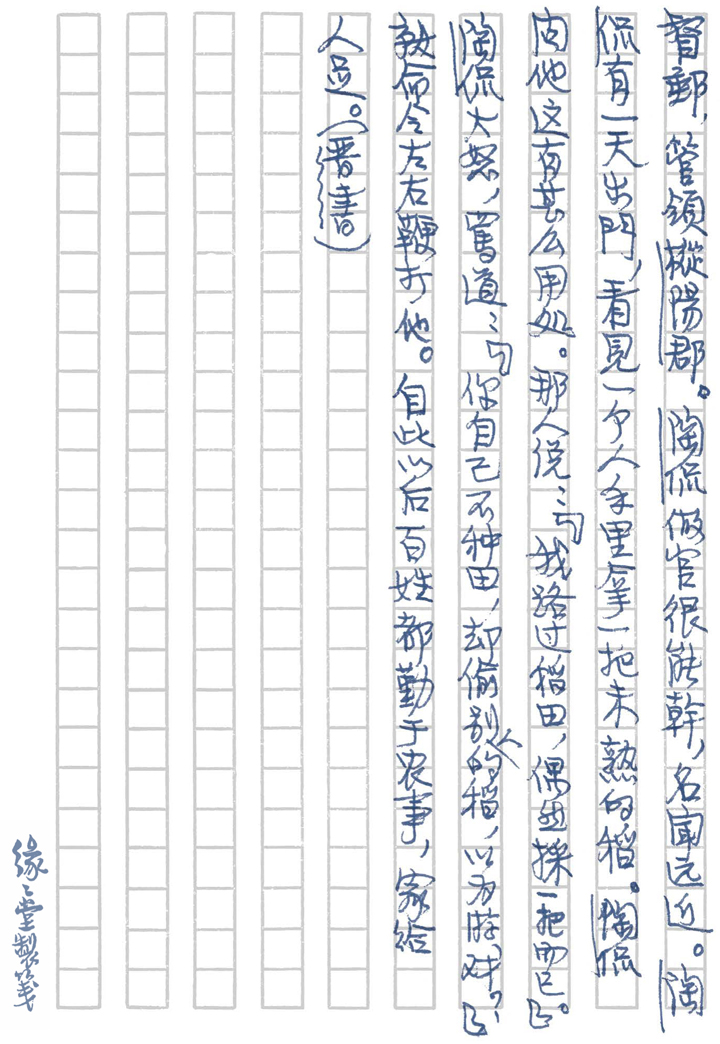陶侃是晋朝人。小时候死了父亲,家里很穷,全靠母亲辅养成人。长后在县里当吏目。有一天,鄱阳孝廉范逵来访他。这时候他家里钱都用完了,无法招待客人。陶侃的母亲就把自己的头发剪下来,卖得些钱,买酒肴待客。客人畅饮尽欢,连仆役们也都满足。范逵辞去,陶侃送行百余里。范逵在途中问他:“你愿意到郡中做官么?”陶侃说:“愿意的,可惜没有机会。”范逵后来访晤庐江太守张夔,极口称赞陶侃。张夔就请他来当督邮,管领枞阳郡。陶侃做官很能干,名闻远近。陶侃有一天出门,看见一个人手里拿一把未熟的稻。陶侃问他这有甚么用处。那人说:“我路过稻田,偶然采一把而已。”陶侃大怒,骂道:“你自己不种田,却偷别人的稻,以为游戏?”就命令左右鞭打他。自此以后百姓都勤于农事,家给人足。