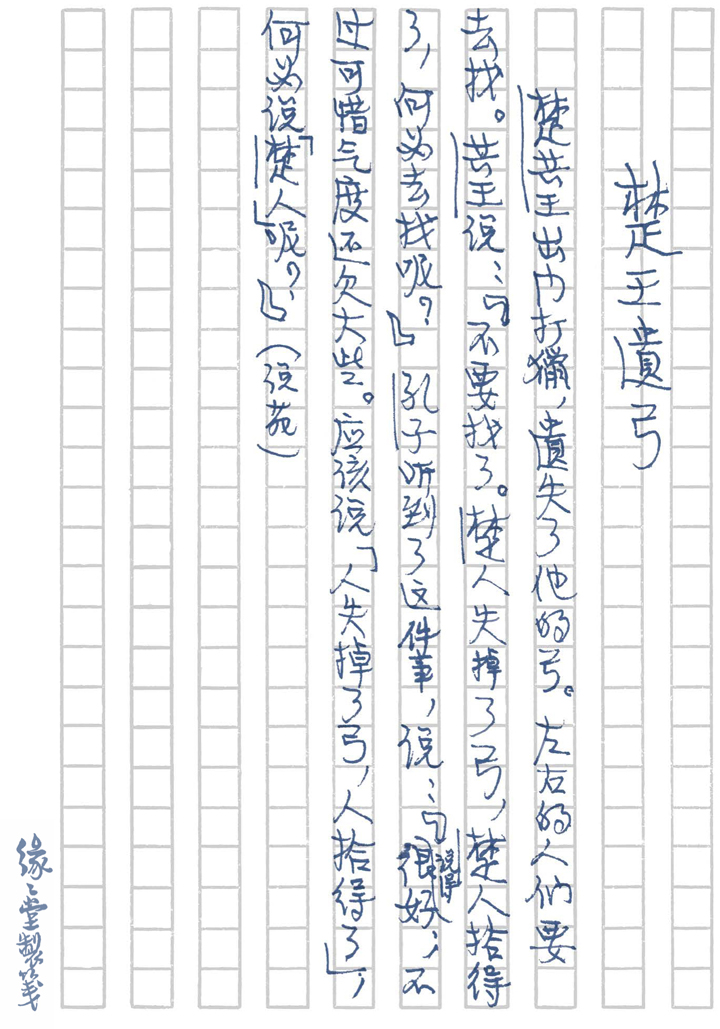 楚共王出门打猎,遗失了他的弓。左右的人们要去找。共王说:“不要找了。楚人失掉了弓,楚人拾得了,何必去找呢?”孔子听到了这件事,说:“说得很好;不过可惜气度还欠大些。应该说‘人失掉了弓,人拾得了’,何必说‘楚人’呢?”