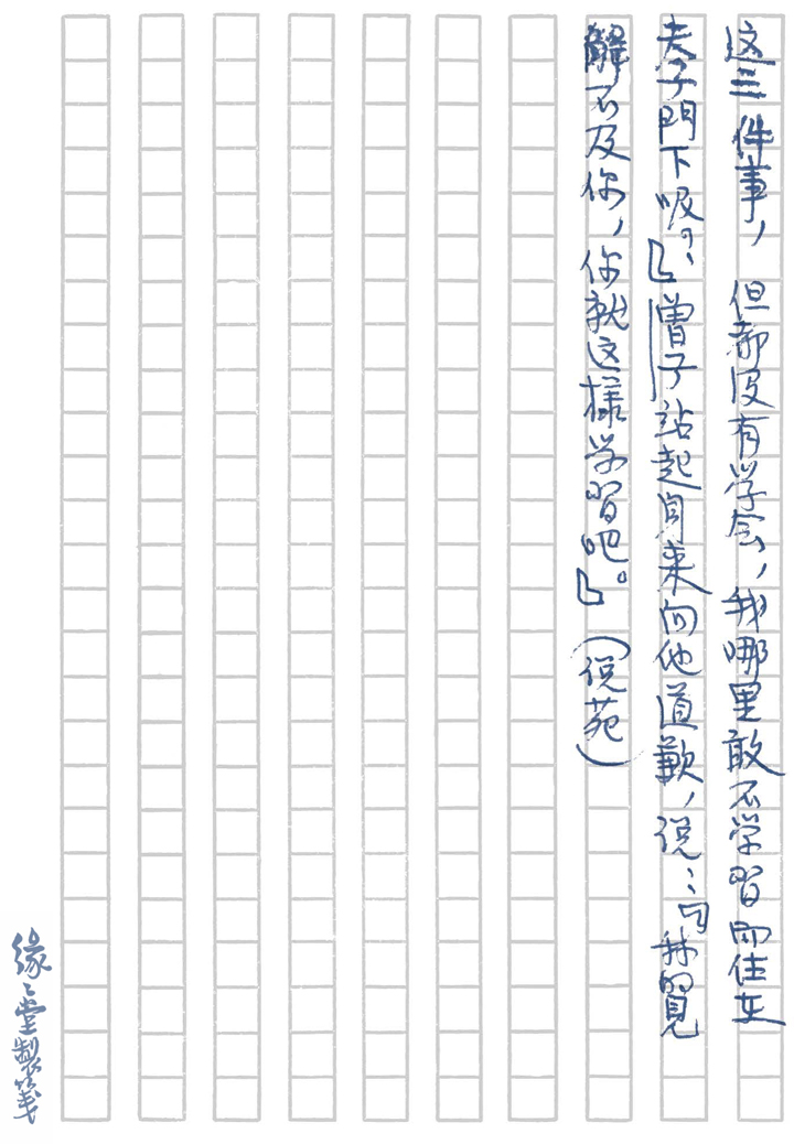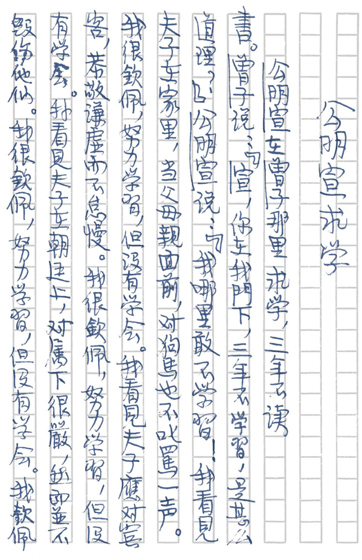 公明宣在曾子那里求学,三年不读书。曾子说:“宣,你在我门下,三年不学习,是甚么道理?”公明宣说:“我哪里敢不学习!我看见夫子在家里,当父母亲面前,对狗马也不叱骂一声。我很钦佩,努力学习,但没有学会。我看见夫子应对宾客,恭敬谦虚而不怠慢。我很钦佩,努力学习,但没有学会。我看见夫子在朝廷上,对属下很严,然而并不毁伤他们。我很钦佩,努力学习,但没有学会。我钦佩这三件事,但都没有学会,我哪里敢不学习而住在夫子门下呢?”曾子站起身来向他道歉,说:“我的见解不及你,你就这样学习吧。”
