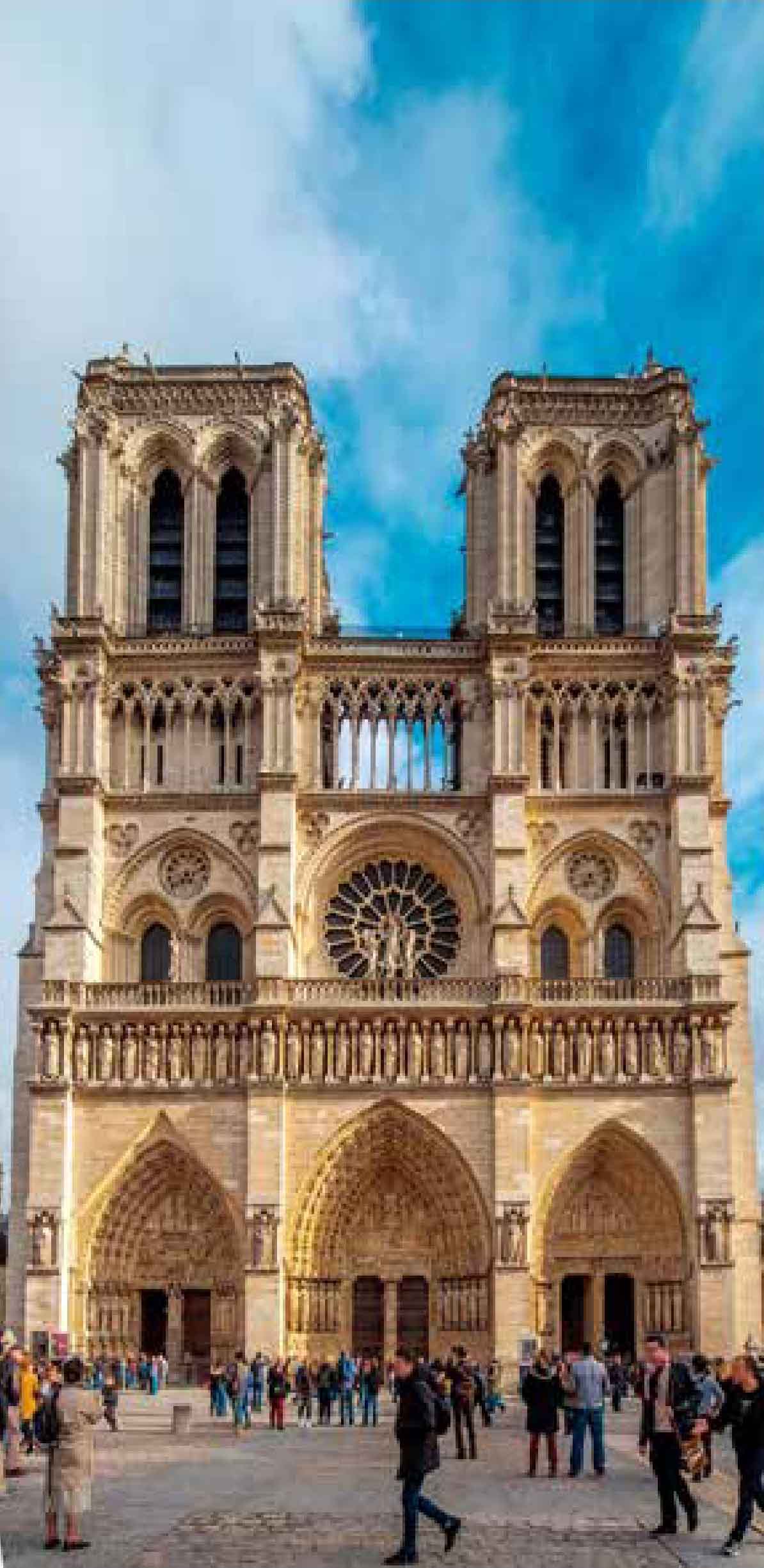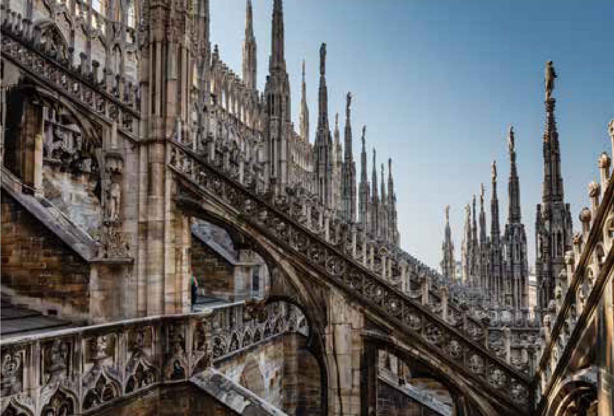这种建筑有种种派别,但其中最能尽量发挥“高”和“尖”的特色的,要算哥特式(Gothic)。那种教堂现今留存在法兰西、意大利等处的,很多很多。其形式,为了极度地要求垂直的效果,不用粗的柱子而用许多细柱合成的柱束;又不用壁,柱束之间统用尖头的窗,因为尖头可以引导人心向上。室内用许多尖头的拱门,屋顶上用许多很尖的塔。故遥望哥特式的教堂,好像一丛雨后春笋,又好像一把火焰。当时这种建筑样式不限于寺院,凡城郭、学校、公所、邸宅,都受它的影响。而在意大利,这种“尖、高”的建筑术尤为发达。他们一味求高,不顾力学的限制而冒险地试建,有几处教堂竟是中途停工。违背建筑的构成的约束而浪漫地偏重形式,其结果必然失败。故哥特式建筑样式,不久跟了教会权与封建制的衰落而被废弃,后来同归于尽。现在我们游观巴黎、科隆,但见巴黎圣母院、科隆大教堂矗立在广场的残阳中,告示着过去的光荣。