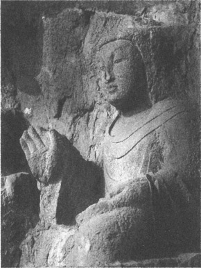 唐代龙门石窟以大卢舍那像龛群雕最为著名。这座依据《华严经》雕凿的摩崖式佛龛,以雍容大度、气宇非凡的卢舍那佛为中心,用一周极富情态质感的美术群体形象将佛国世界那种充满了祥和色彩的理想意境表达得淋漓尽致。这组雕像充分体现了大唐帝国强大的物质力量和精神力量,显示了唐代雕刻艺术的最高成就。