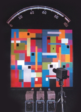 图6是一块画有多种颜色的面板(称为“蒙德里安色板”,只是风格有点像蒙德里安,与画家本人无关)。下方有红、绿、蓝三种光源(每一种光的强度可以独立调节)。在这块色板中,选一个绿色的条块(上面有“×”标记),通过调节相应的入射光源,可以让这一条块反射定量的红、绿、蓝三种光。反射出的红、绿、蓝光的强度,可以用精密的仪器(图右边的装置)测量出来。科学家请受试者观察那个带有标记的条块的颜色。当该条块反射30单位红光、60单位绿光、10单位蓝光时,受试者说看到的是绿色。重复上述实验,这一次让该条块反射60单位红光、30单位绿光、10单位蓝光,受试者说看到的还是绿色。这个结果有点让人意外,因为后一次实验中,反射的红光强度是绿光的2倍!多次重复这样的实验,得到的结果是相同的。