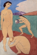 一是和谐对称。 画中看到三个女人的形象:两个女人位于前景处,第三个女人靠近后景。前景中两个女人的稍微重叠确定了她们之间的联系和空间位置。第三个人看起来要小得多,因此也离得更远。画被分成三个区域:一是包含白色外衣的橘红色前景;二是位于中心部分的绿色水域;三是蓝色的天空、白云以及紫色和橘红色的两座远山构成的背景。这样一来,整幅画底部的色彩与顶部的色彩就对称了:前景中的白衣服与背景里的白云;前景中的橘红地面与背景里的橘红山峦;那裸露的黄色躯体同样也前后呼应。这几种对称的色彩的中心支点,是位于女人手里的那束花。这束花虽然很小,却能吸引人的眼球,因为花的边缘是用画中独一无二的纯蓝色勾勒的。