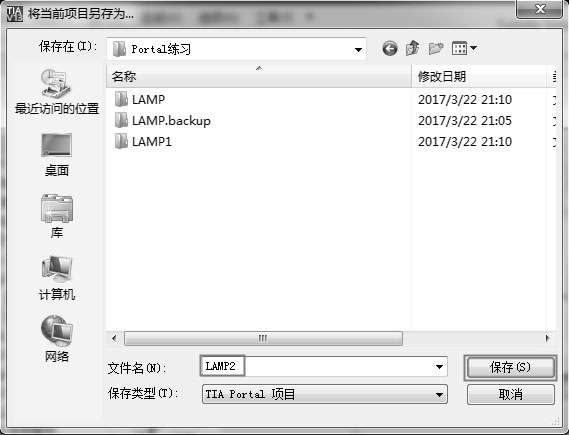 保存项目的方法:在项目视图中,选中菜单栏中“项目”,单击“另存为(A)…”命令,弹出如图3-25所示,在“文件名”中输入新的文件名(本例为LAMP2),单击“保存”按钮,另存为项目完成。