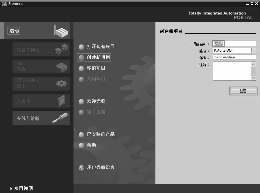 ① 方法1:打开TIA博途软件,如图3-17所示,选中“启动”→“创建新项目”,在“项目名称”中输入新建的项目名称(本例为LAMP),单击“创建”按钮,完成新建项目。此处用手机扫描二维码可观看视频“创建新项目”。