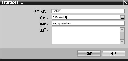 ② 方法2:如果TIA博途软件处于打开状态,在项目视图中,选中菜单栏中“项目”,单击“新建”命令,如图3-18所示,弹出如图3-19所示的界面,在“项目名称”中输入新建的项目名称(本例为LAMP),单击“创建”按钮,完成新建项目。
