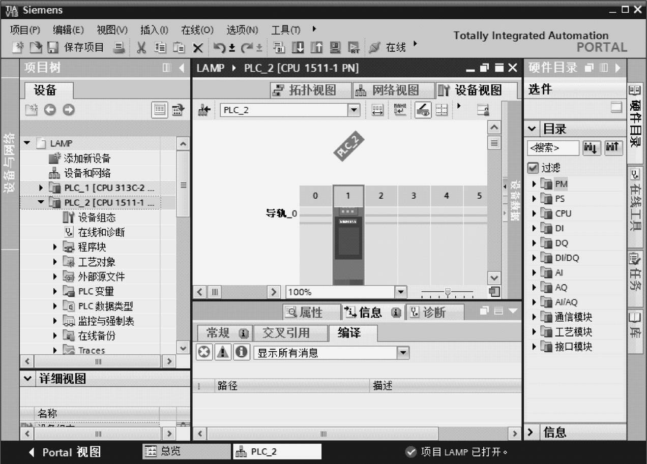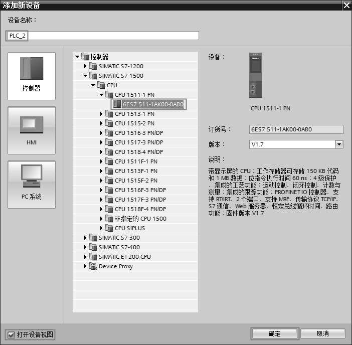 项目视图是TIA博途软件的硬件组态和编程的主窗口,在项目树的设备栏中,双击“添加新设备”选项卡栏,然后弹出“添加新设备”对话框,如图3-20所示。可以修改设备名称,也可保持系统默认名称。选择需要的设备,本例为:6ES7 511-1AK00-0AB0,勾选“打开设备视图”,单击“确定”按钮,完成新设备添加,并打开设备视图,如图3-21所示。