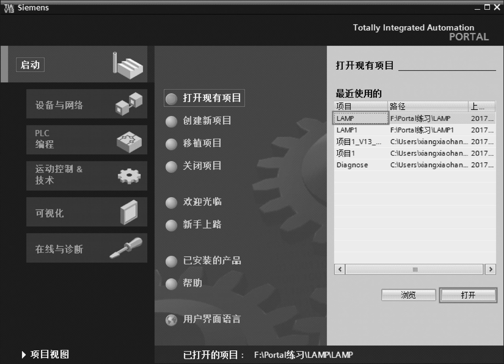 ① 方法1:打开TIA博途软件,如图3-22所示,选中“启动”→“打开现有项目”,再选中要打开的项目,本例为“LAMP”,单击“打开”按钮,选中的项目即可打开。此处用手机扫描二维码可观看视频“打开已有项目”。