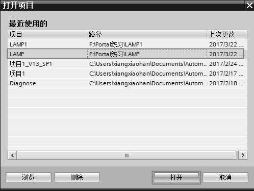 ② 方法2:如果TIA博途软件处于打开状态,而且在项目视图中,选中菜单栏中“项目”,单击“打开”命令,弹出如图3-23所示的界面,再选中要打开的项目,本例为“LAMP”,单击“打开”按钮,现有的项目即可打开。
