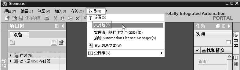 西门子公司的PLC模块进行了固件升级或者推出了新型号模块后,没有经过升级的博途软件,一般不支持这些新模块(即使勉强支持,也会有警告信息弹出),因此当读者遇到这种情况时,就需要安装最新的支持包,安装方法如下。