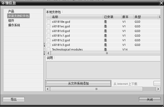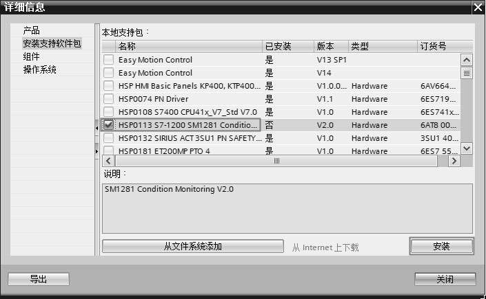 在博途软件项目视图的菜单中,如图3-97所示,单击“选项”→“支持包”命令,弹出“安装信息”界面,如图3-98所示,选择“安装支持软件包”选项,单击“从文件系统添加”按钮(前提是支持包已经下载到本计算机中),在本计算机中找到存放支持包的位置,本例支持包存放位置如图3-99所示界面,选中需要安装的支持包,单击“打开”按钮。